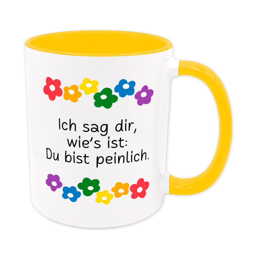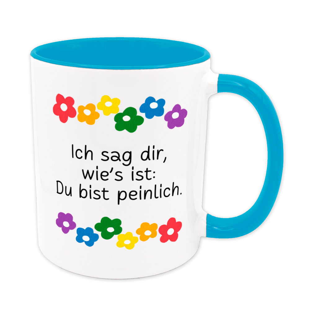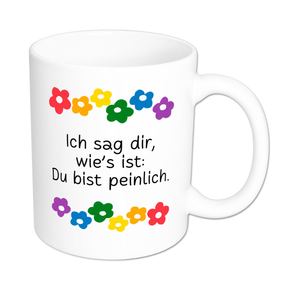 Was soll man um den heißen Brei herumreden. Direktheit wird zwar allgemein nicht sehr geschätzt, birgt jedoch ungeahntes Potenzial zur Konfliktentstehung und Ausbildung von Krititfähigkeit. Mit der Sprüchetasse „Ich sag Dir, wie´s ist: Du bist peinlich.“ hast Du den ersten Schritt zur absoluten Ehrlichkeit geschafft.