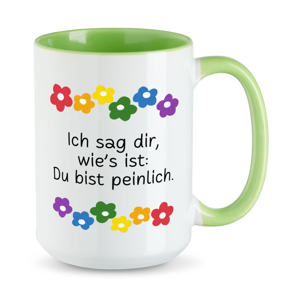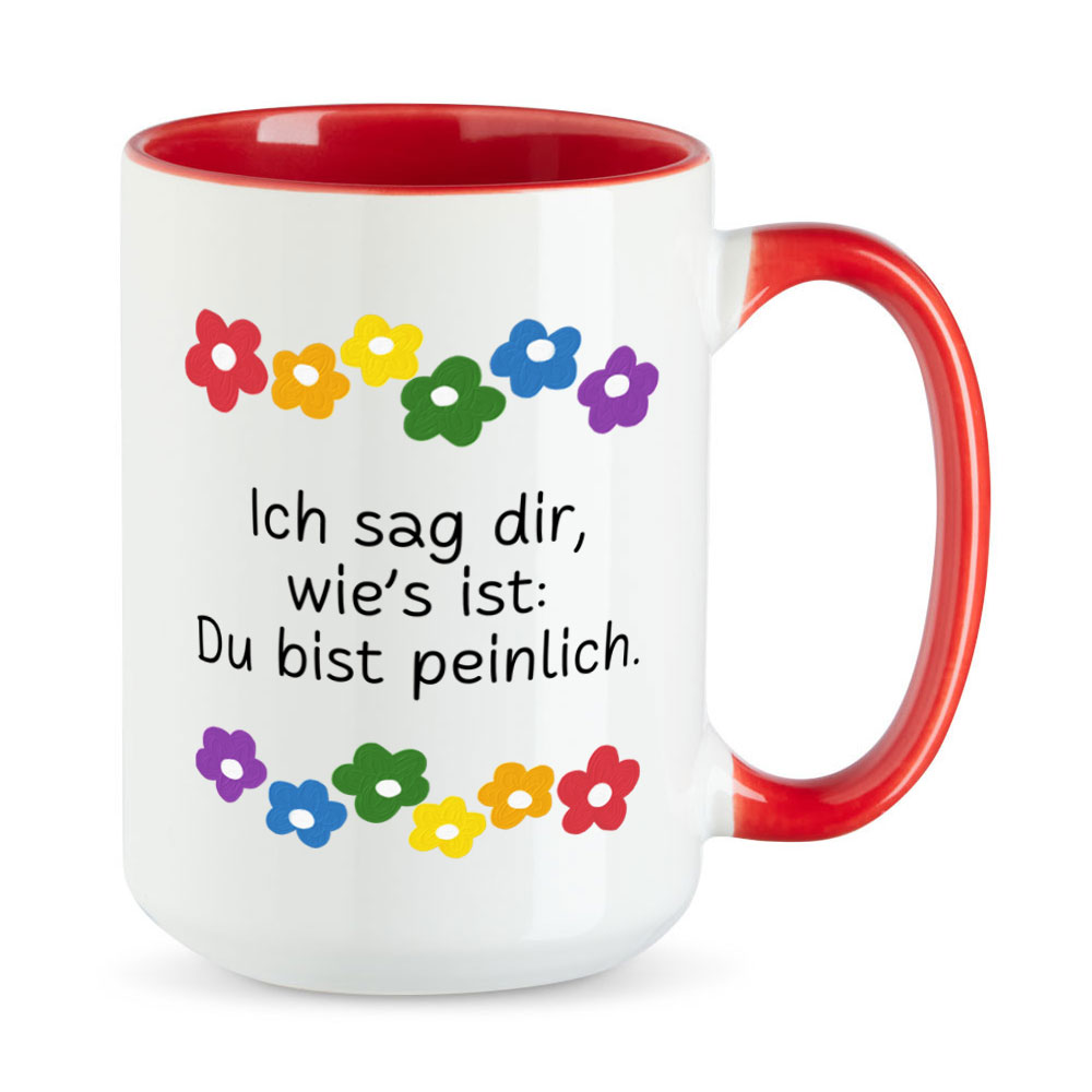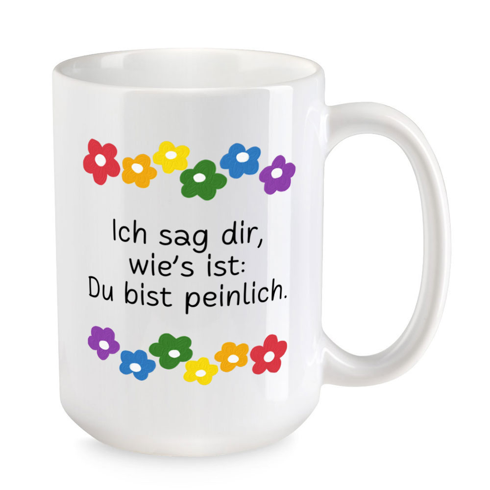 Was soll man um den heißen Brei herumreden. Direktheit wird zwar allgemein nicht sehr geschätzt, birgt jedoch ungeahntes Potenzial zur Konfliktentstehung und Ausbildung von Krititfähigkeit. Mit der extra großen Sprüchetasse „Ich sag Dir, wie´s ist: Du bist peinlich.“ hast Du den ersten Schritt zur absoluten Ehrlichkeit geschafft.