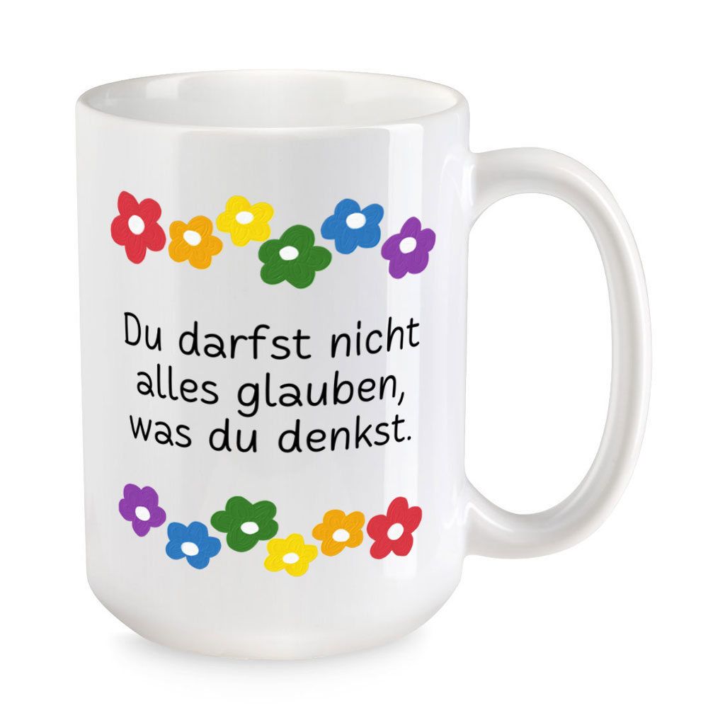 Diese ausgelatschten Pfade im Gehirn, die Dir immer dasselbe erzählen wollen. Obwohl Du genau weißt, dass dieser oder jeder Gedanke Quatsch ist, unbewiesen oder längst widerlegt. Deswegen erinnert Dich diese extra große Sprüchetasse mit Gute-Laune-Blümchen: „Du darfst nicht alles glauben, was Du denkst.“