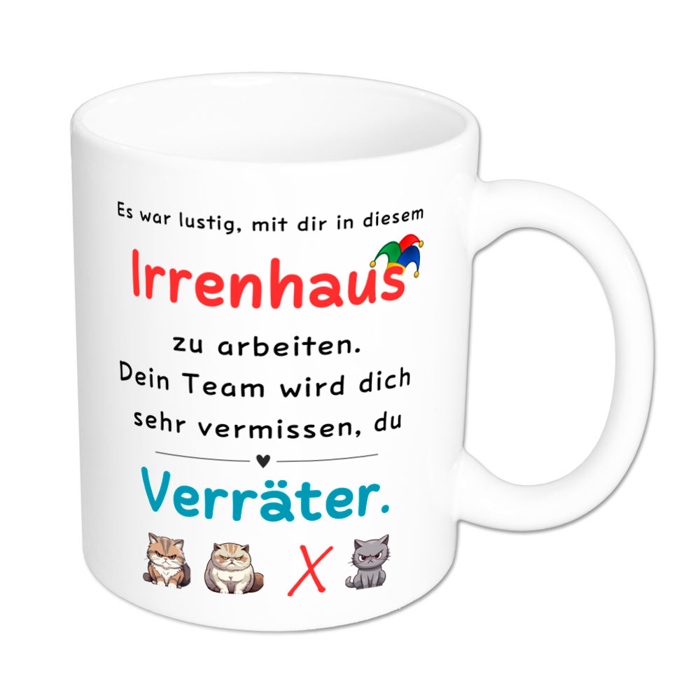 Dein Kollege, mit dem Du so viel Spaß bei der Arbeit hattest, verlässt das Team. Du brauchst ein witziges Abschiedsgeschenk! Die witzige Sprüche-Tasse „Es war lustig, mit dir in diesem Irrenhaus zu arbeiten. Dein Team wird dich sehr vermissen, du Verräter“ ist da genau richtig. Untermalt wird die Botschaft noch von drei grimmig dreinschauenden Katzen, in deren Mitte ein rotes Kreuz für den fehlenden Kollegen prangt. Das Wort Irrenhaus ist garniert mit einer Narrenkappe. Diese lustige Tasse ist eine schöne Aufmerksamkeit vom gesamten Team.