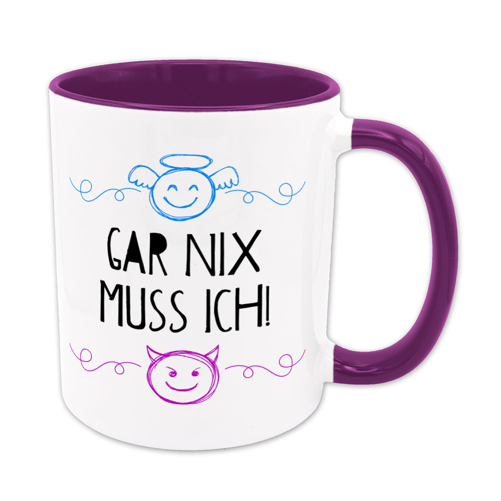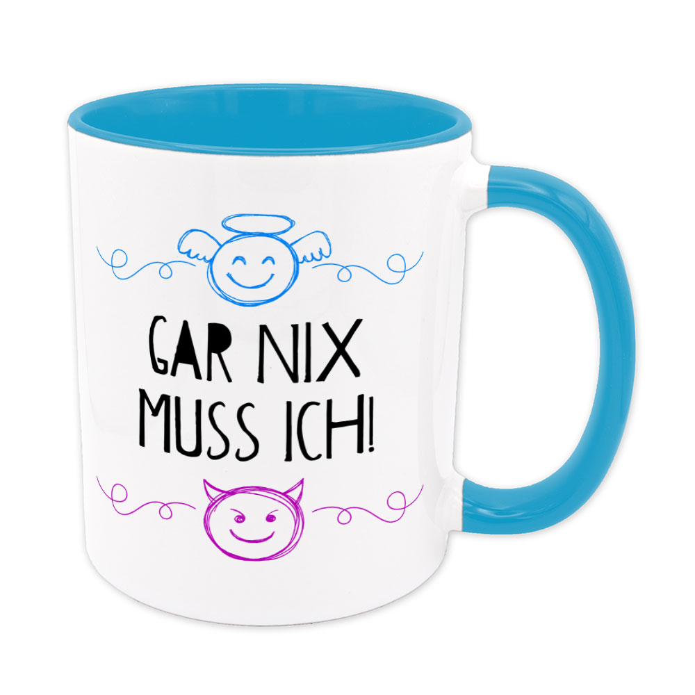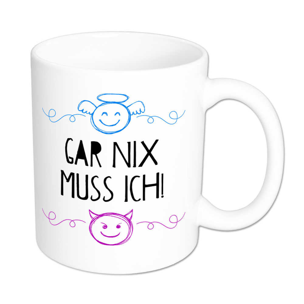 Gar nix muss ich! Die witzige Sprüchetasse mit Ruhe aus der Engelchen-Kollektion von buntbedruckt.de. Also fast gar nix. Denn kaufen solltest Du die Tasse schon.