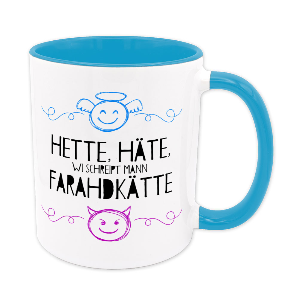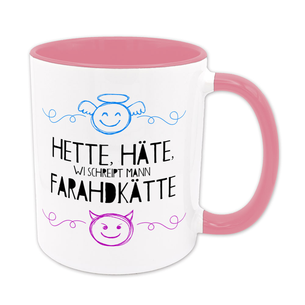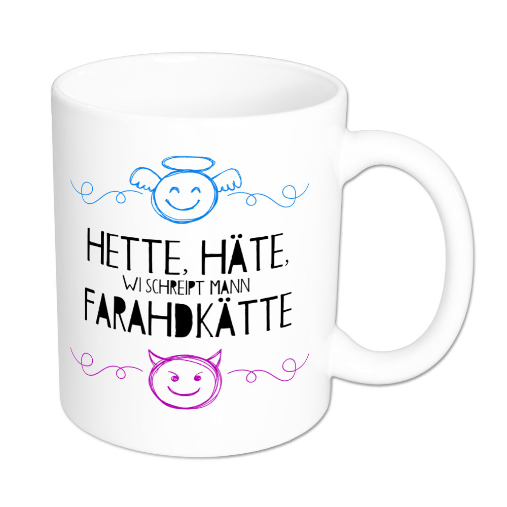 Hätte, hätte, Fahrradkette. Kennt wahrscheinlich jeder. Aber wie schreipt mann eigendlich Farahdkätte? Diese Tasse ist ein Seitenhieb auf die immer schlechter werdende Rechtschreibung.