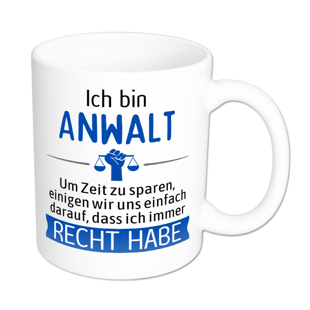 Eigentlich ist es leicht zu verstehen. Es gibt Menschen, die haben aufgrund ihres Berufes Recht. Immer. Mit der Tasse „Ich bin Anwalt. Um Zeit zu sparen, einigen wir uns einfach darauf, dass ich immer Recht habe.“ machst Du diesen Menschen eine große Freude, denn nun müssen sie nicht mehr so viel erklären.