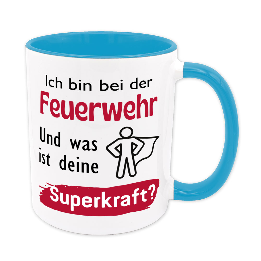 Bei der Feuerwehr sein ist eine wahre Superkraft, die Menschen diesen Berufes jeden Tag mit Wissen und Leidenschaft nutzen. Die Tasse „Ich bin bei der Feuerwehr. Und was ist deine Superkraft?“ kommt selbstbewusst mit Superheld im Umhang daher.