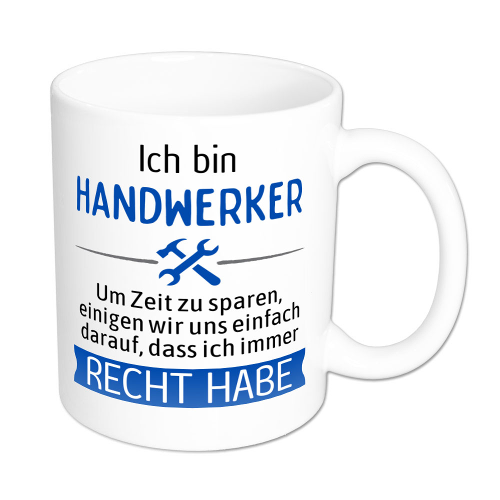 Eigentlich ist es leicht zu verstehen. Es gibt Menschen, die haben aufgrund ihres Berufes Recht. Immer. Mit der Tasse „Ich bin Handwerker. Um Zeit zu sparen, einigen wir uns einfach darauf, dass ich immer Recht habe.“ machst Du diesen Menschen eine große Freude, denn nun müssen sie nicht mehr so viel erklären.