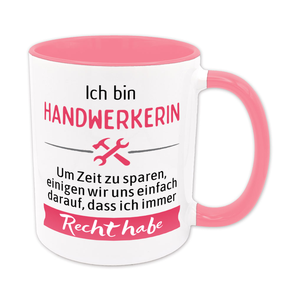 Eigentlich ist es leicht zu verstehen. Es gibt Menschen, die haben aufgrund ihres Berufes Recht. Immer. Mit der Tasse „Ich bin Handwerkerin. Um Zeit zu sparen, einigen wir uns einfach darauf, dass ich immer Recht habe.“ machst Du diesen Menschen eine große Freude, denn nun müssen sie nicht mehr so viel erklären.