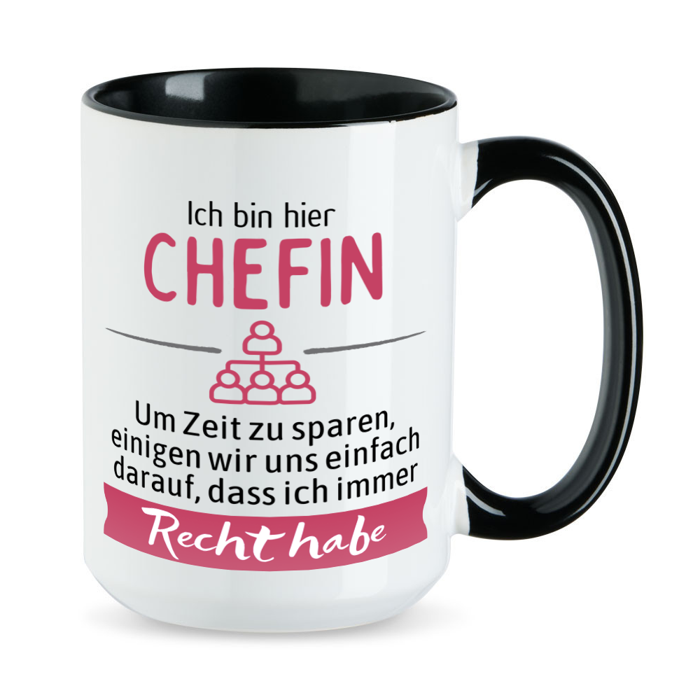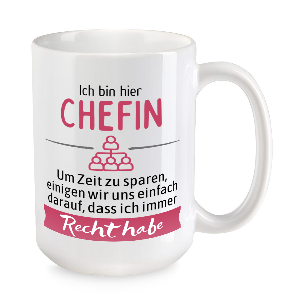 Das XL-Tassen-Motiv: Ich bin hier Chefin. Um Zeit zu sparen, einigen wir uns einfach darauf, dass ich immer Recht habe