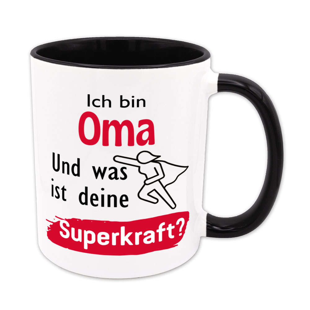 Oma sein ist eine wahre Superkraft, die viele Menschen jeden Tag mit Geduld. Liebe und Hingabe nutzen. Die Tasse „Ich bin Oma. Und was ist deine Superkraft?“ kommt selbstbewusst mit Superheldin im Umhang daher.
