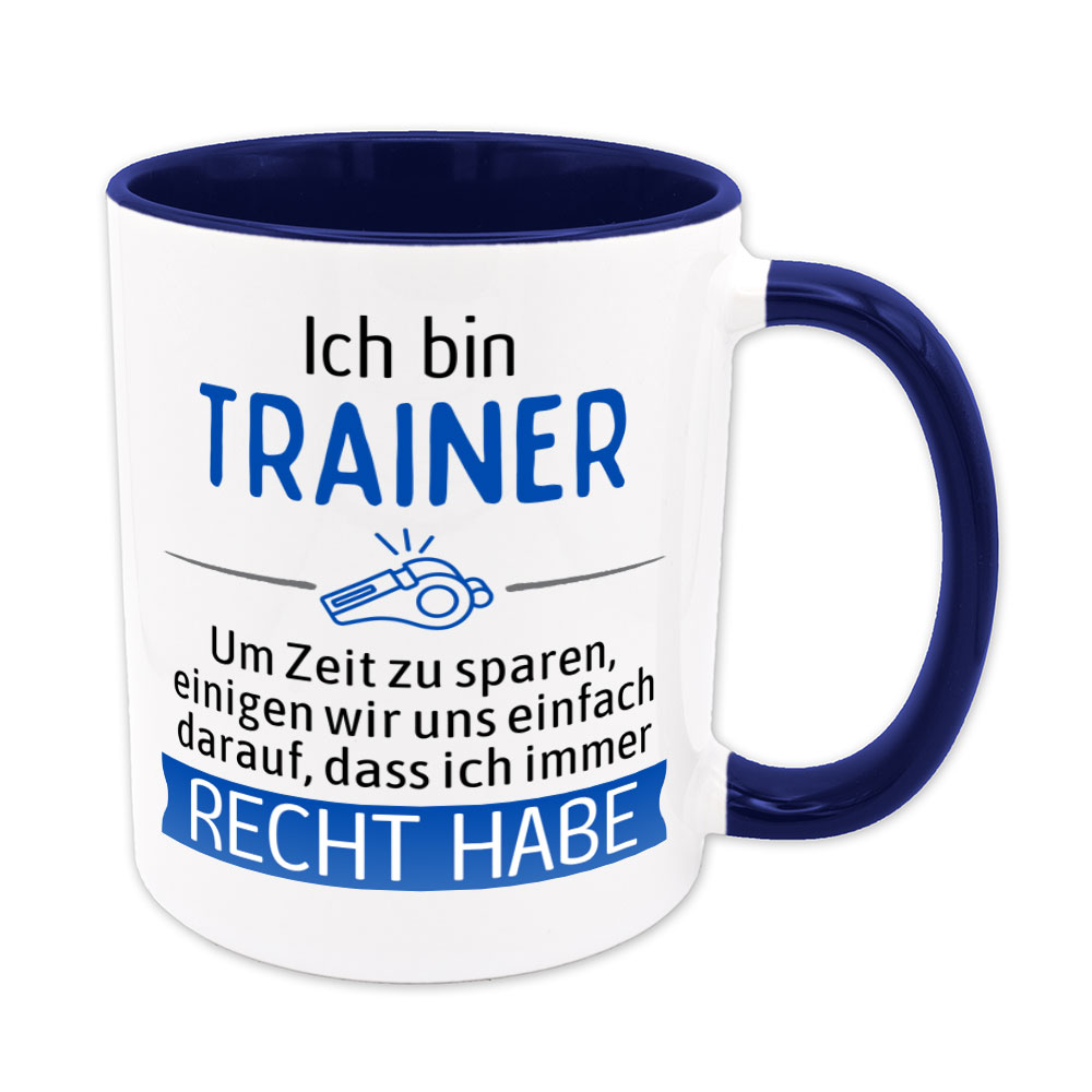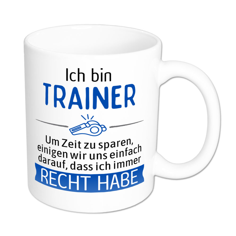 Eigentlich ist es leicht zu verstehen. Es gibt Menschen, die haben aufgrund ihres Berufes Recht. Immer. Mit der Tasse „Ich bin Trainer. Um Zeit zu sparen, einigen wir uns einfach darauf, dass ich immer Recht habe.“ machst Du diesen Menschen eine große Freude, denn nun müssen sie nicht mehr so viel erklären.