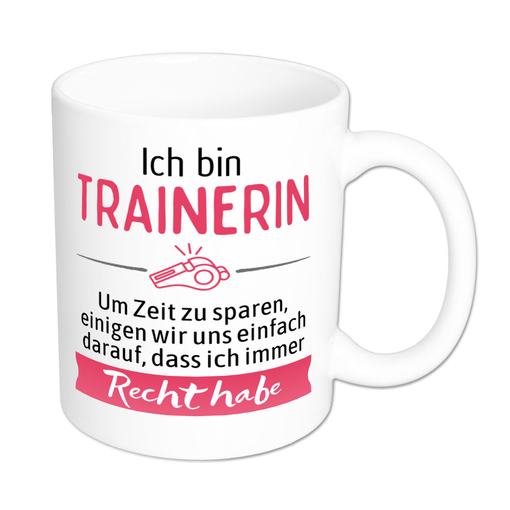 Eigentlich ist es leicht zu verstehen. Es gibt Menschen, die haben aufgrund ihres Berufes Recht. Immer. Mit der Tasse „Ich bin Trainerin. Um Zeit zu sparen, einigen wir uns einfach darauf, dass ich immer Recht habe.“ machst Du diesen Menschen eine große Freude, denn nun müssen sie nicht mehr so viel erklären.