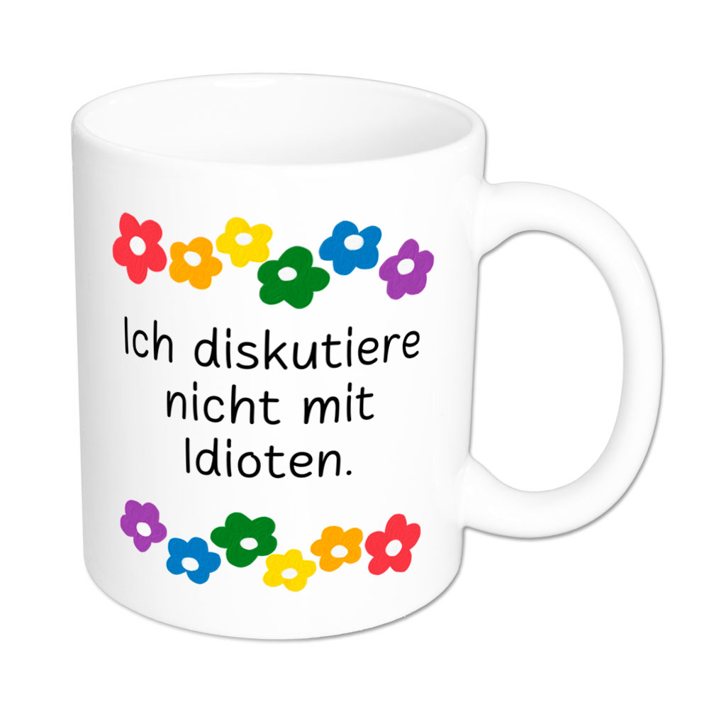 Die superbunte Blümchen-Sprüchetasse „Ich diskutiere nicht mit Idioten.“ ist vielseitig einsetzbar, denn die Definition eines solchen bleibt natürlich Dir überlassen.