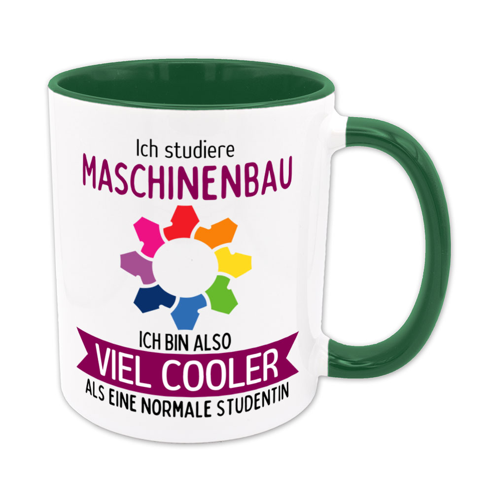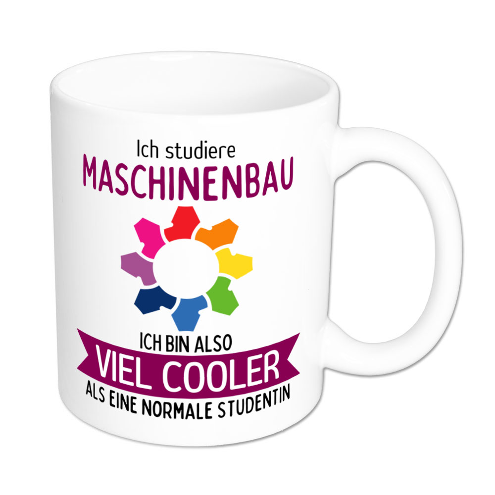 Wer Maschinenbau studiert, liebt die Möglichkeiten der Technik. Dieses Studienfach erfordert sowohl Interesse an Mathematik und Physik als auch umfassende Fähigkeiten im Projektmanagement. Da kommt so manche Studierende bestimmt auf die Idee: „Ich studiere Maschinenbau, ich bin also viel cooler als eine normale Studentin“- und genau das steht auf dieser lustigen Sprüchetasse.