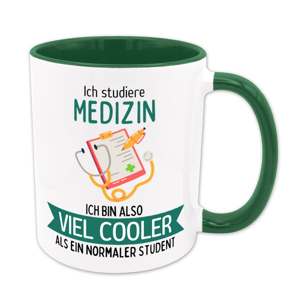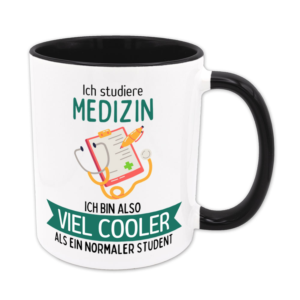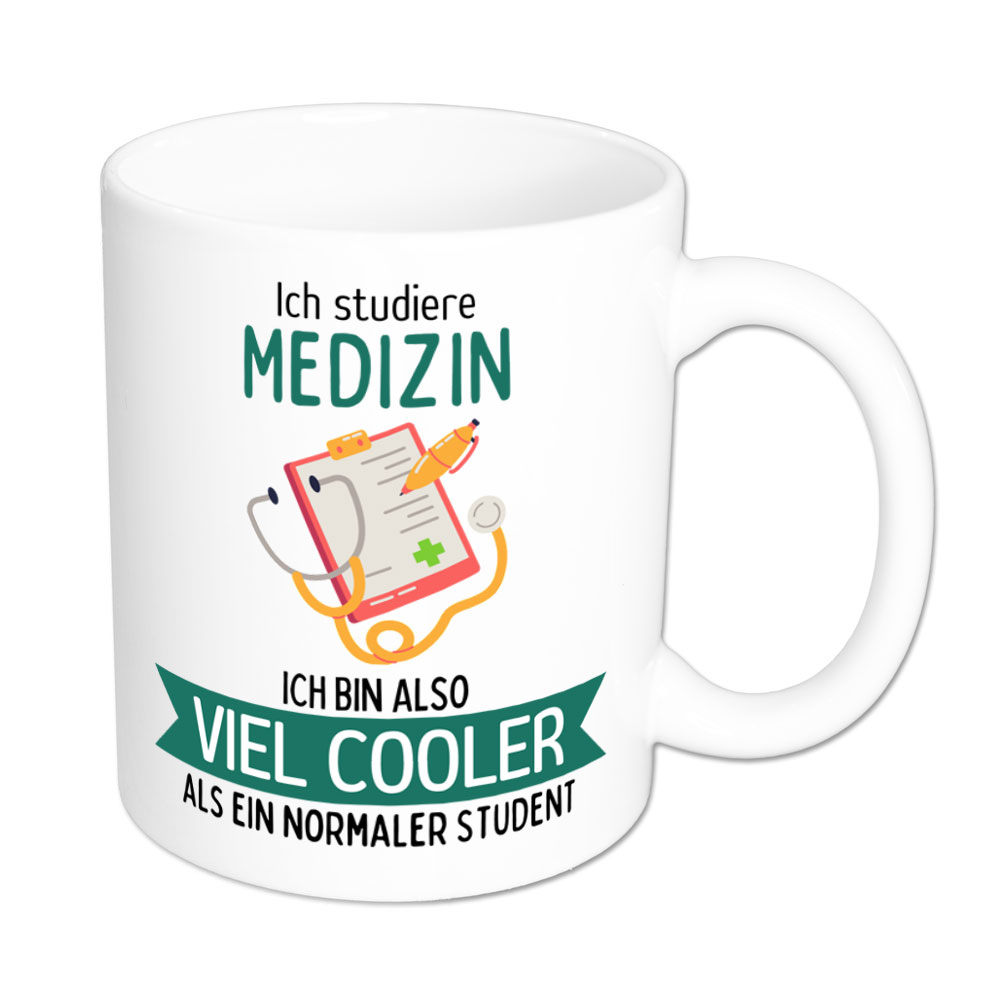 Wer Medizin studiert, liebt alles, was den menschlichen Körper krank oder gesund machen kann. Dieses Studienfach erfordert enorm viel Fleiß, Durchhaltevermögen, analytisches Denken und Empathie. Da kommt so mancher Studierender bestimmt auf die Idee: „Ich studiere Medizin, ich bin also viel cooler als ein normaler Student“- und genau das steht auf dieser lustigen Sprüchetasse.