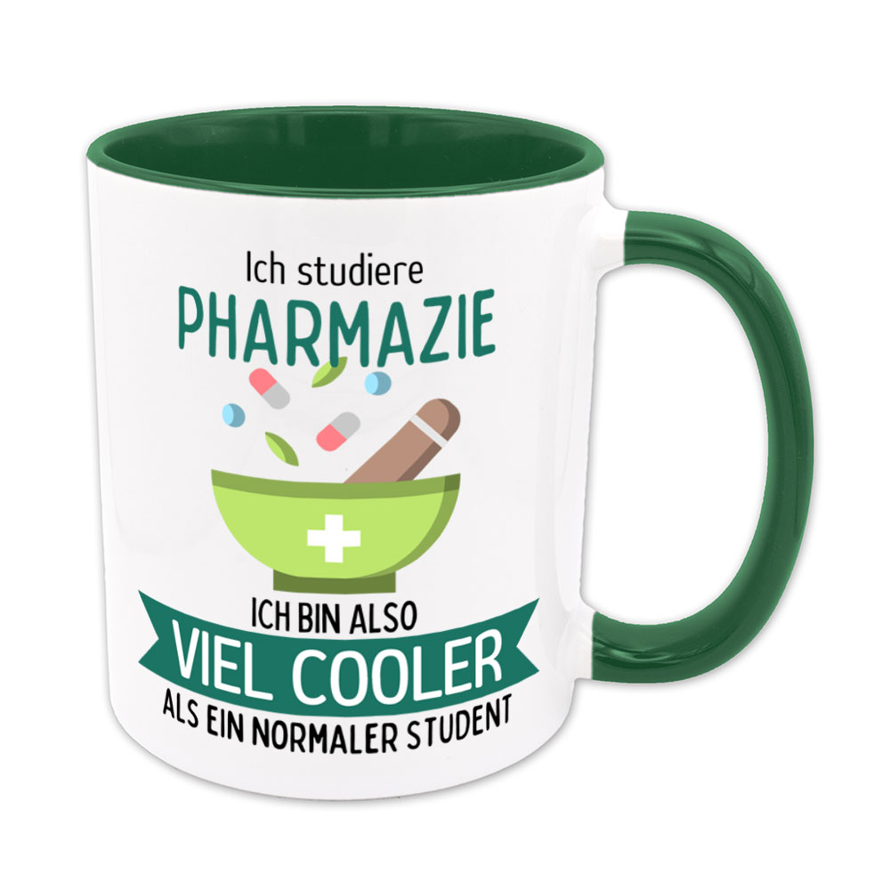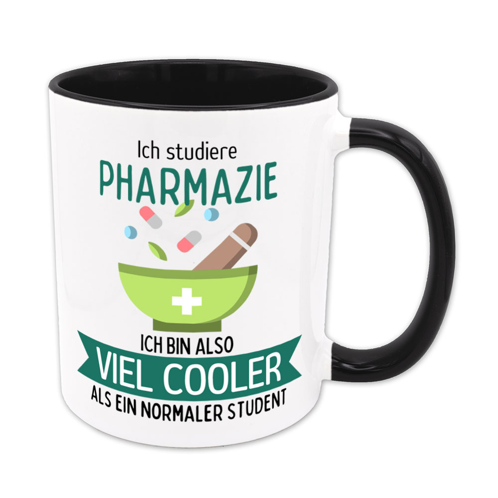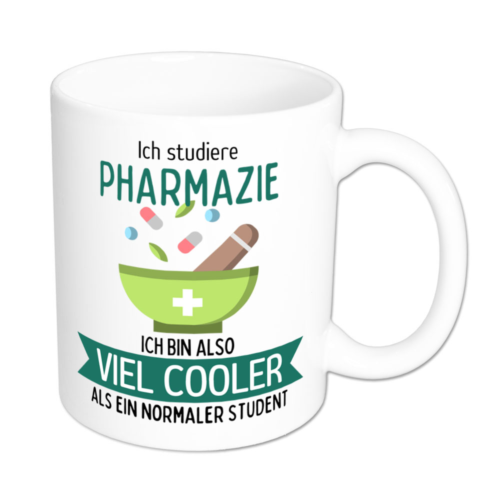 Wer Pharmazie studiert, liebt chemische Details und Medizin. Dieses Studienfach erfordert biologisches Verständnis und Gewissenhaftigkeit. Da kommt so mancher Studierender bestimmt auf die Idee: „Ich studiere Pharmazie, ich bin also viel cooler als ein normaler Student“- und genau das steht auf dieser lustigen Tasse, garniert mit Tabletten, Kapseln und einem Mörser.