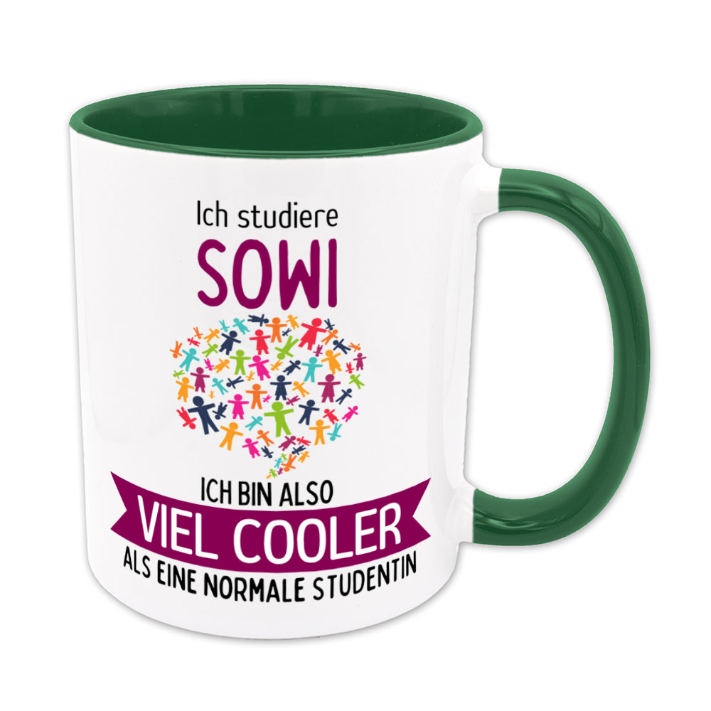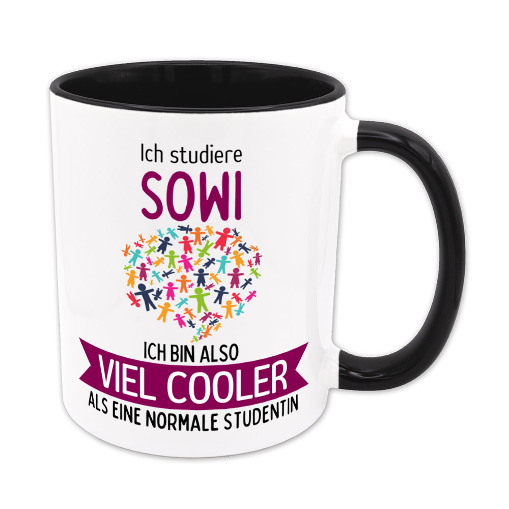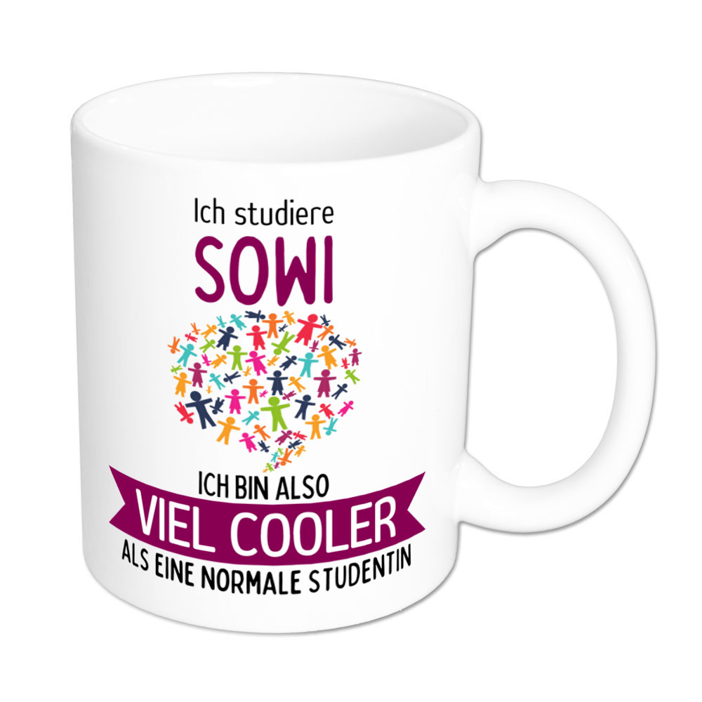 Wer Sozialwissenschaften (abgekürzt Sowi) studiert, liebt die Wissenschaft der Kommunikation und die menschliche Gesellschaft. Dieses Studienfach erfordert fachübergreifendes Denken und Empathie. Da kommt so manche Studierende bestimmt auf die Idee: „Ich studiere Sowi, ich bin also viel cooler als eine normale Studentin“- und genau das steht auf dieser lustigen Sprüchetasse.