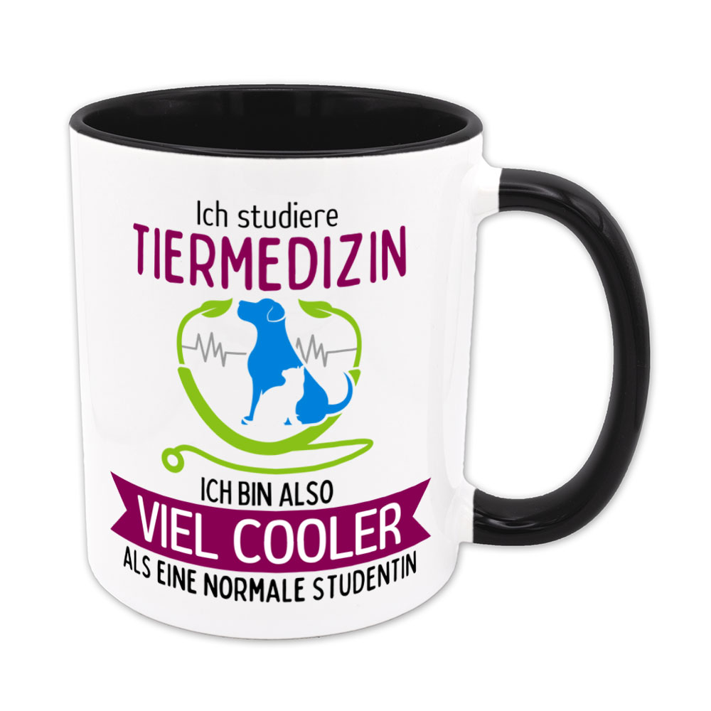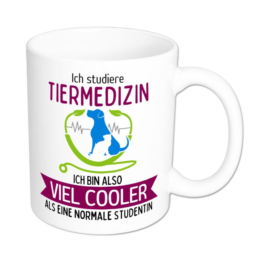 Wer Tiermedizin studiert, liebt alles, was die vielen unterschiedlichen Tierarten krank oder gesund machen kann. Dieses Studienfach ist enorm breit gefächert und erfordert viel Fleiß, Durchhaltevermögen, analytisches Denken und ein hervorragendes Gedächtnis. Da kommt so manche Studierende bestimmt auf die Idee: „Ich studiere Tiermedizin, ich bin also viel cooler als eine normale Studentin“- und genau das steht auf dieser lustigen Sprüchetasse.