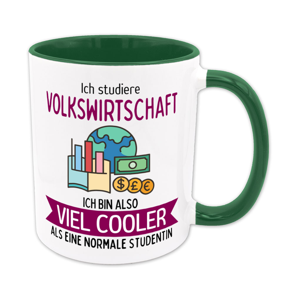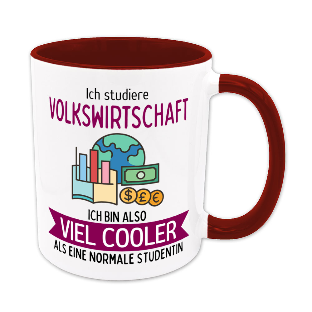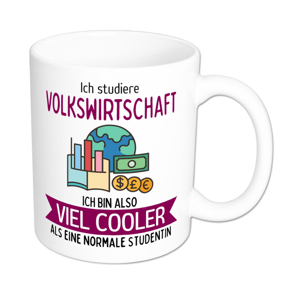 Wer Volkswirtschaft studiert, liebt große und komplizierte Zusammenhänge. Dieses Studienfach erfordert wissenschaftliches Arbeiten und Vorstellungskraft. Da kommt so manche Studierende bestimmt auf die Idee: „Ich studiere Volkswirtschaft, ich bin also viel cooler als eine normale Studentin“- und genau das steht auf dieser lustigen Sprüchetasse.