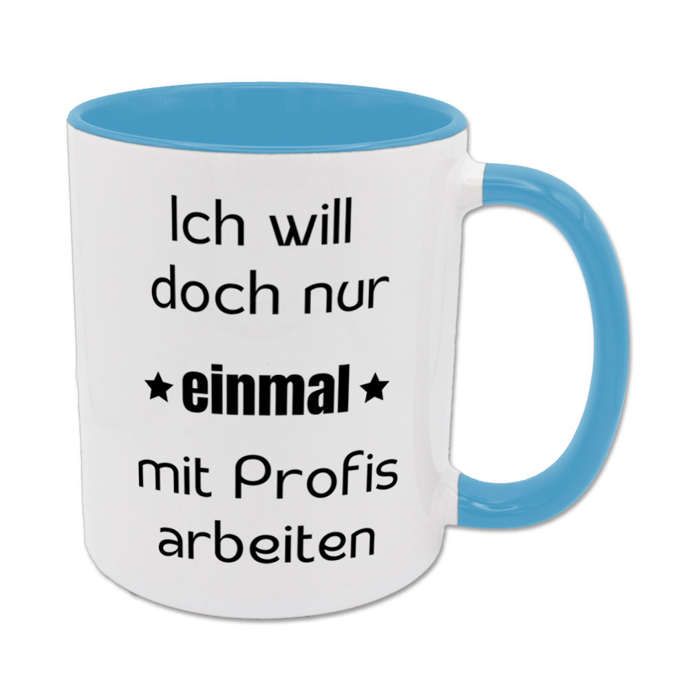 Profi – das ist ein gern genutzter Begriff, der aber alles mögliche meinen kann. Und manchmal geht etwas vielleicht langsamer oder sagen wir… anders, als Du es wolltest. Und dann passt die Tasse „Ich will doch nur einmal mit Profis arbeiten“ besonders gut zur Kaffeepause. Und nein, das gilt natürlich nicht für anwesende Personen.