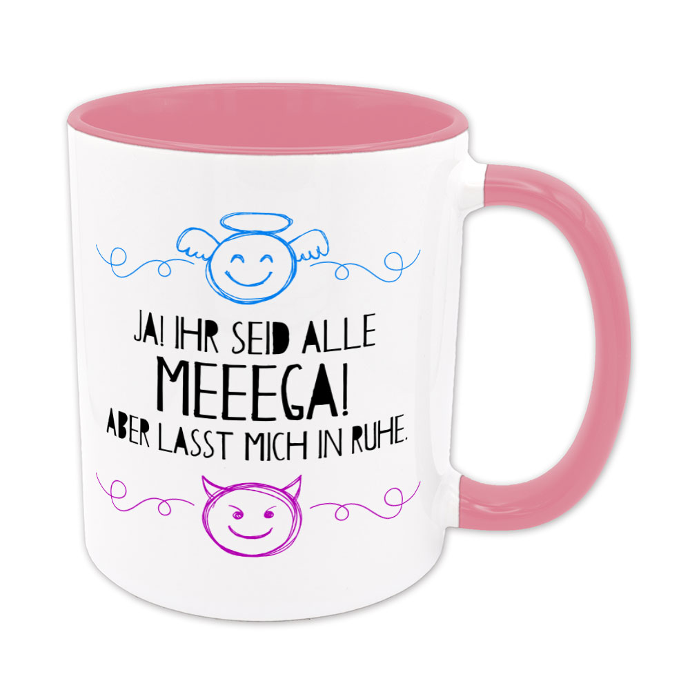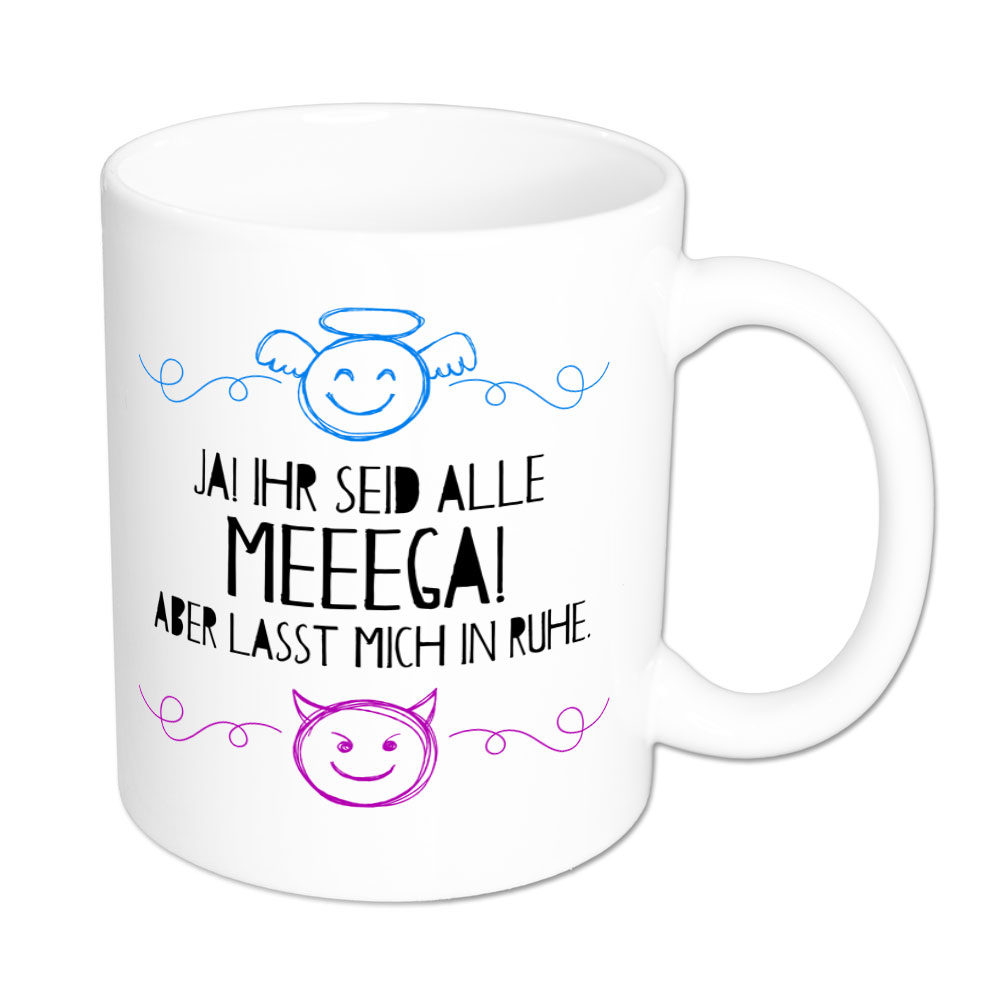 Ihr habt das Lob und ich meine Ruhe. Das geht einfach meeega mit der lustigen Sprüchetasse „Ja! Ihr seid alle meeega! Aber lasst mich in Ruhe.“. Hilft gegen arrogante Mitmenschen und sorgt für innere Ausgeglichenheit – denn Du stehst entspannt über den Ego-Dingen.