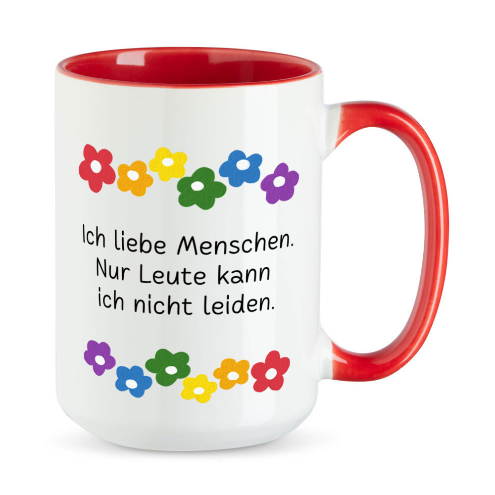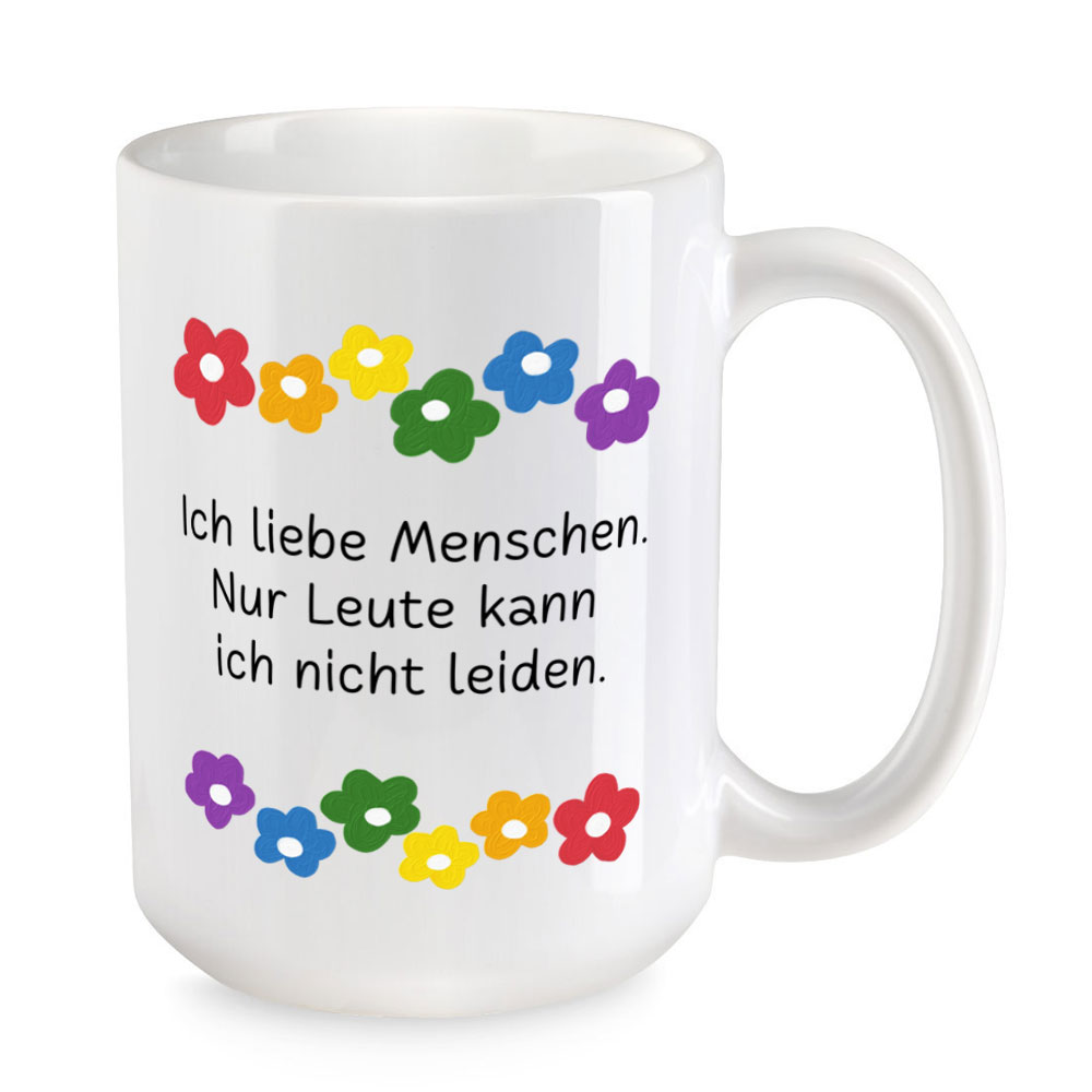 Es gibt ja die komischsten Personen. Manche mag man, andere nicht. Die extra große Sprüchetasse „Ich liebe Menschen. Nur Leute kann ich nicht leiden.“ drückt das Dilemma auf bunt-fröhliche Weise aus.
