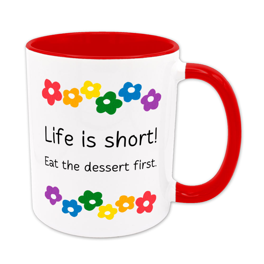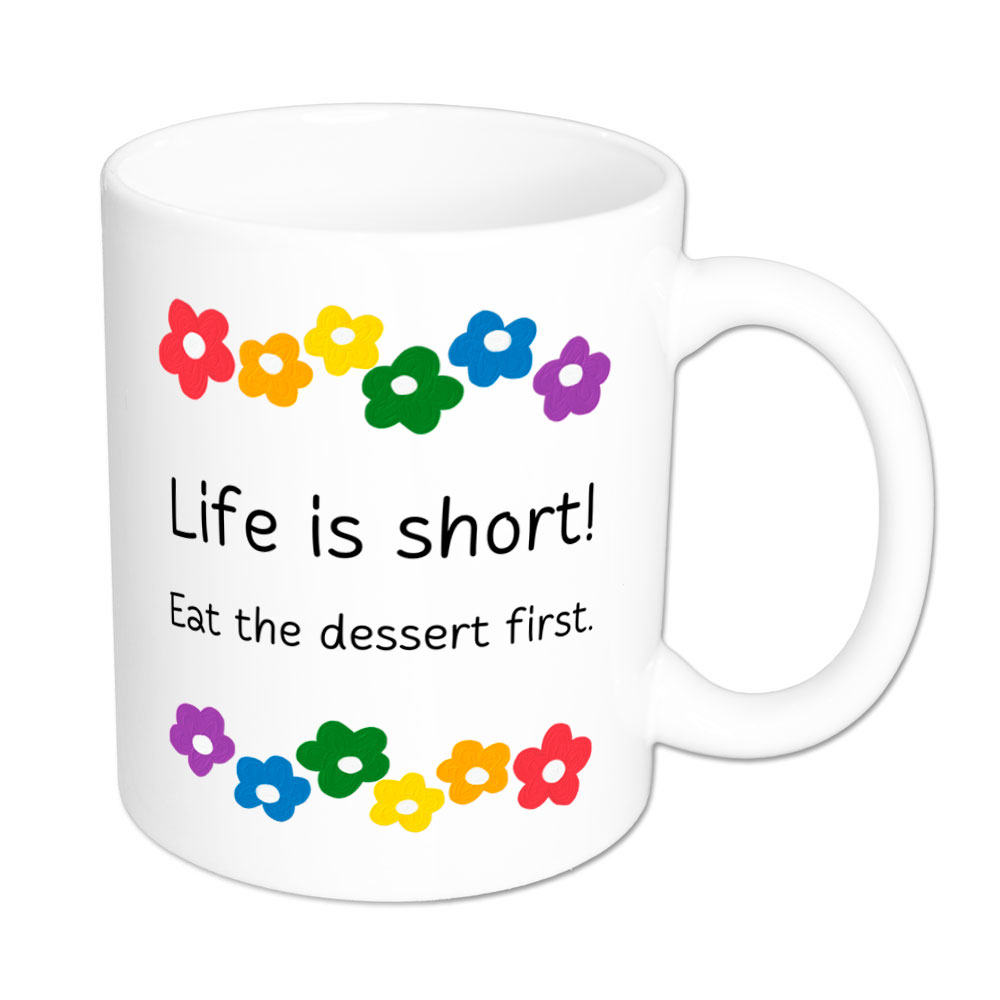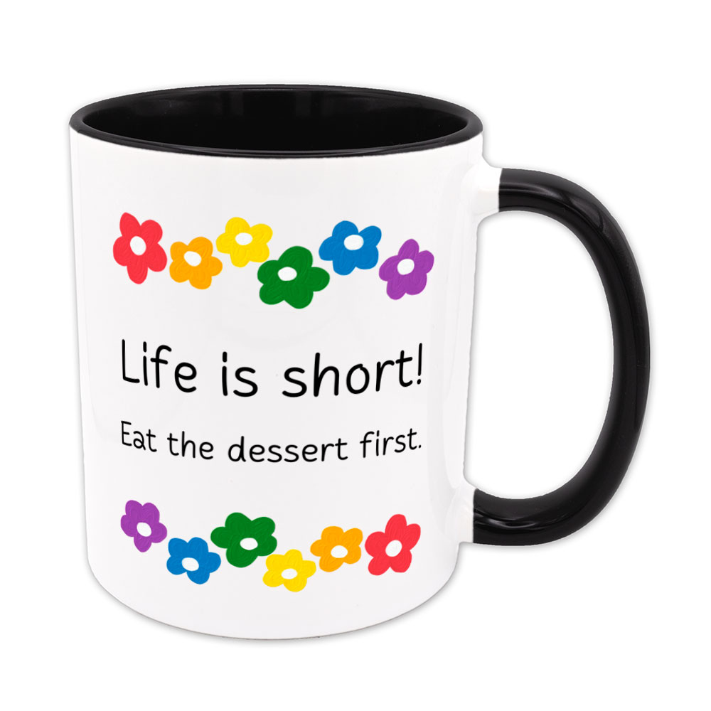 Den ganzen Tag arbeitest Du fleißig Deine nie enden wollende To-Do-Liste ab, um Dir dann abends, am Wochenende, im Urlaub endlich mal etwas zu gönnen. Bis Du merkst: Das kann doch nicht alles sein. Das Leben findet JETZT statt! Also: Iss das Dessert zuerst. Das Leben ist kurz. Und genau das steht auf dieser quietschbunten Sprüchetasse.