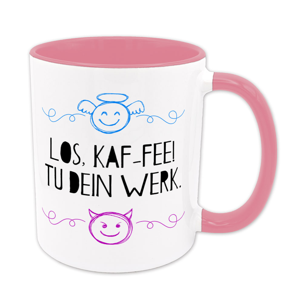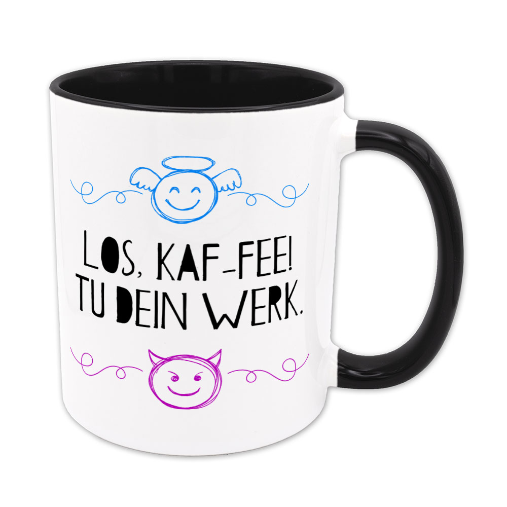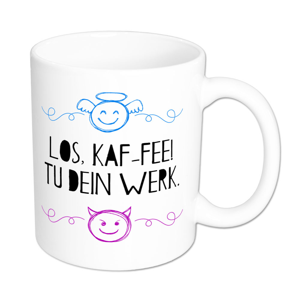 Manchmal muss man selbst dem besten Kaffee – äh pardon, der besten Kaf-Fee – gut zureden, damit das gewünschte Ergebnis auch tatsächlich eintritt. Besonders gut geht das mit unserer Tasse „Los, Kaf-Fee! Tu Dein Werk.“, die der Kaf-Fee nochmal einen kleinen Schubs gibt.