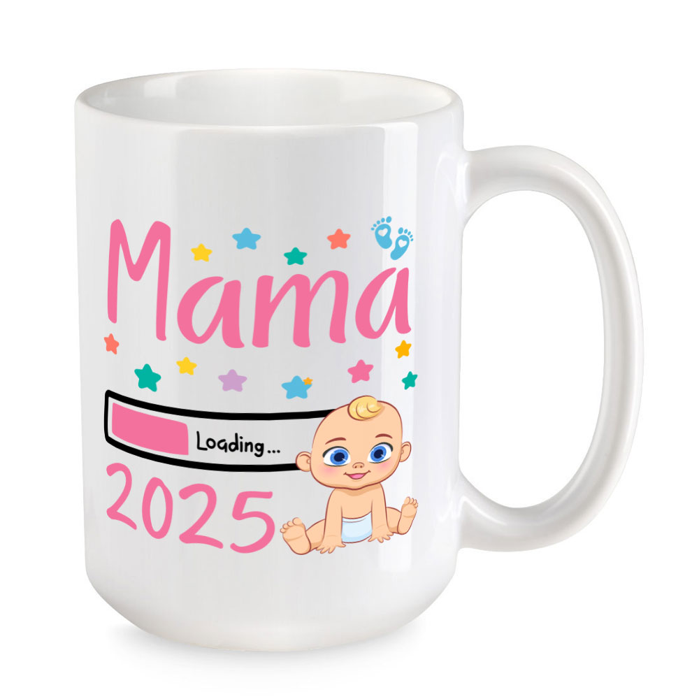 Freudige Ereignisse werfen ihre Schatten voraus, denn die Babys für 2025 sind unterwegs! Die extra große Tasse „Mama Loading 2025“ ist ein schönes Geschenk für jede werdende Mutter, die 2025 endlich ihren Babyboy in den Armen halten darf und es kaum erwarten kann. Die Tasse ist verziert mit Sternen und süßen blauen Babyfüßchen.