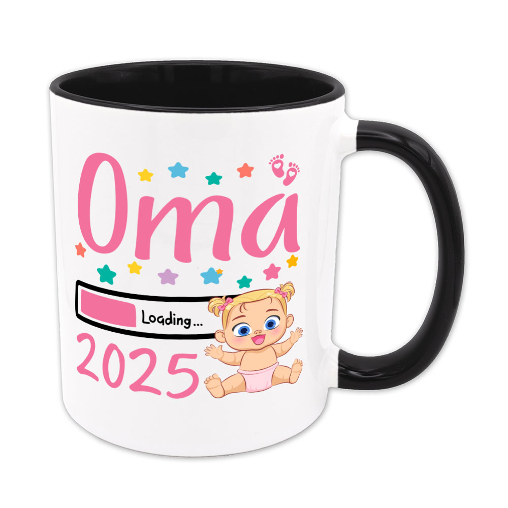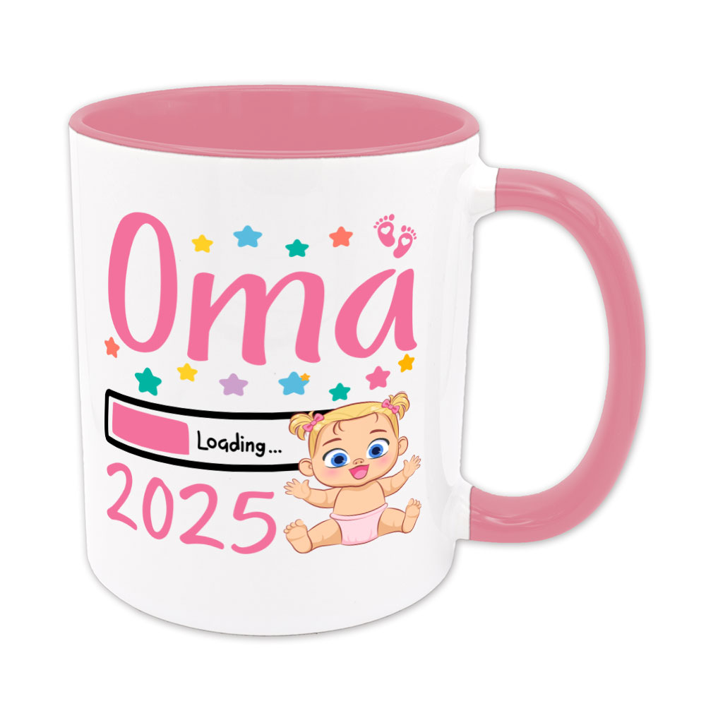 Die Babys für 2025 sind nun unterwegs! Die Tasse „Oma Loading 2025“ ist ein schönes Geschenk für jede Großmutter, die ihr Enkelkind in 2025 kaum noch erwarten kann. Die Tasse ist verziert mit Sternen und süßen rosa Babyfüßchen.