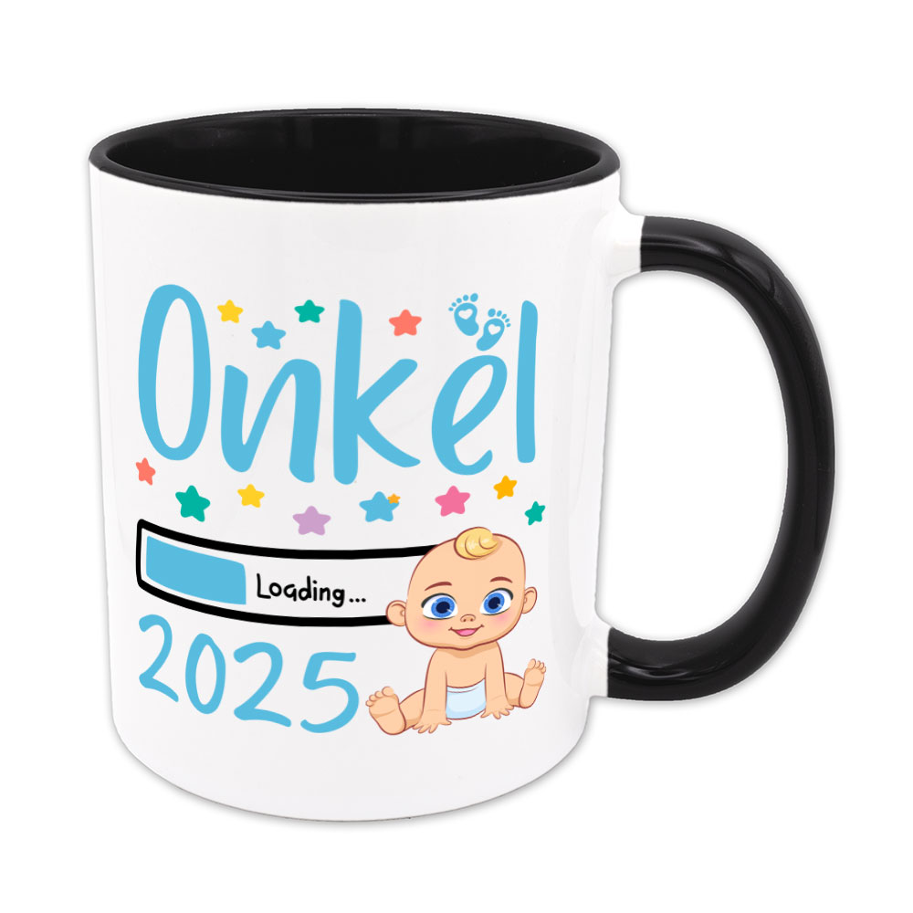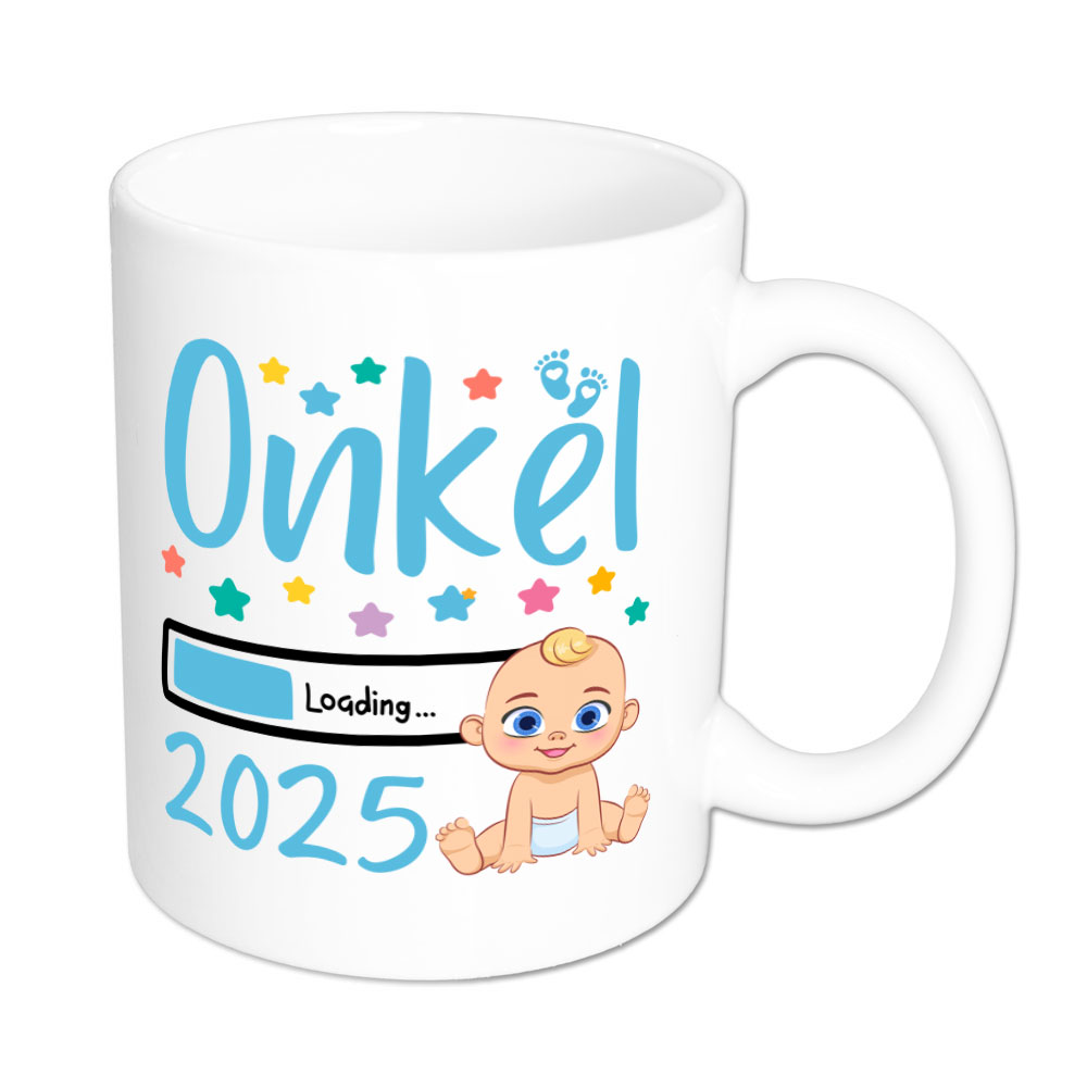 Freudige Ereignisse werfen ihre Schatten voraus, denn die Babys für 2025 sind unterwegs! Die Tasse „Onkel Loading 2025“ ist ein schönes Geschenk für jeden Onkel, der seinen Neffen in 2025 kaum noch erwarten kann. Die Tasse ist verziert mit Sternen und süßen blauen Babyfüßchen.