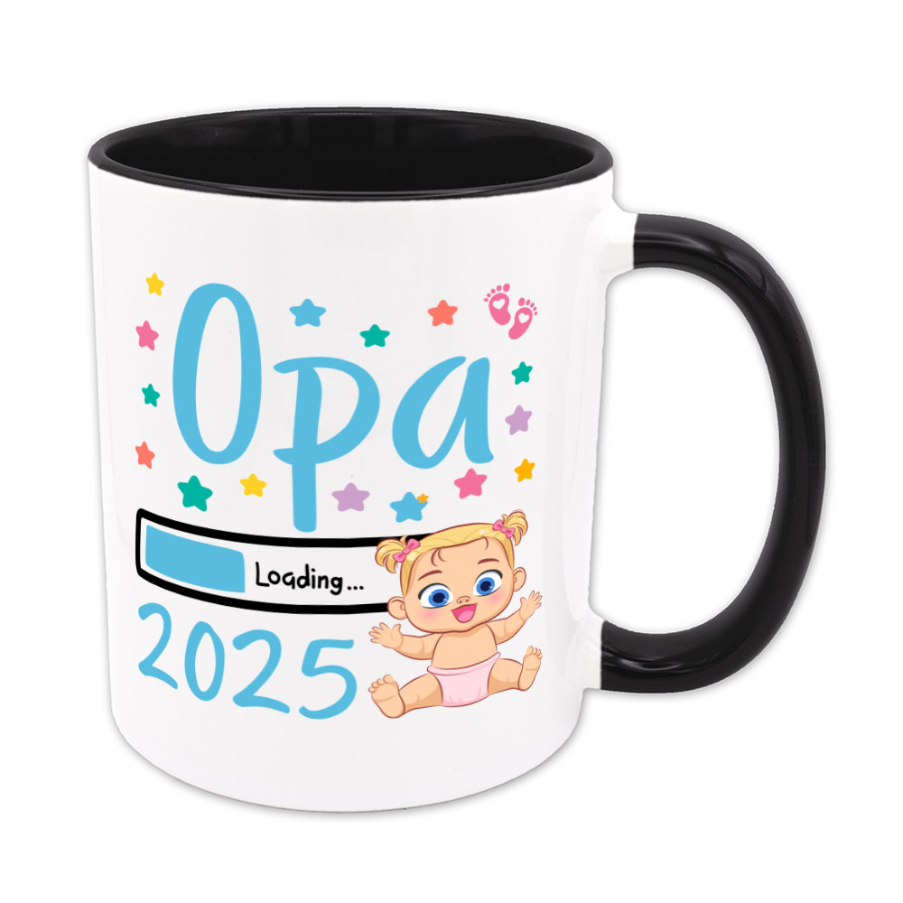 Die Babys für 2025 sind nun unterwegs! Die Tasse „Opa Loading 2025“ ist ein schönes Geschenk für jeden Großvater, der seine Enkeltochter in 2025 kaum noch erwarten kann. Die Tasse ist verziert mit Sternen und süßen rosa Babyfüßchen.