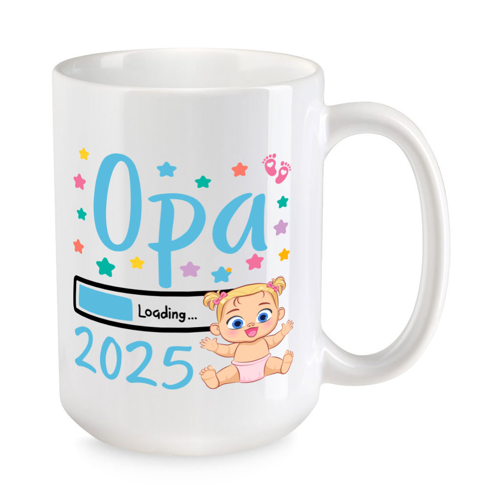 Die Babys für 2025 sind nun unterwegs! Die extra große Tasse „Opa Loading 2025“ ist ein schönes Geschenk für jeden Großvater, der seine Enkeltochter in 2025 kaum noch erwarten kann. Die Tasse ist verziert mit Sternen und süßen rosa Babyfüßchen.