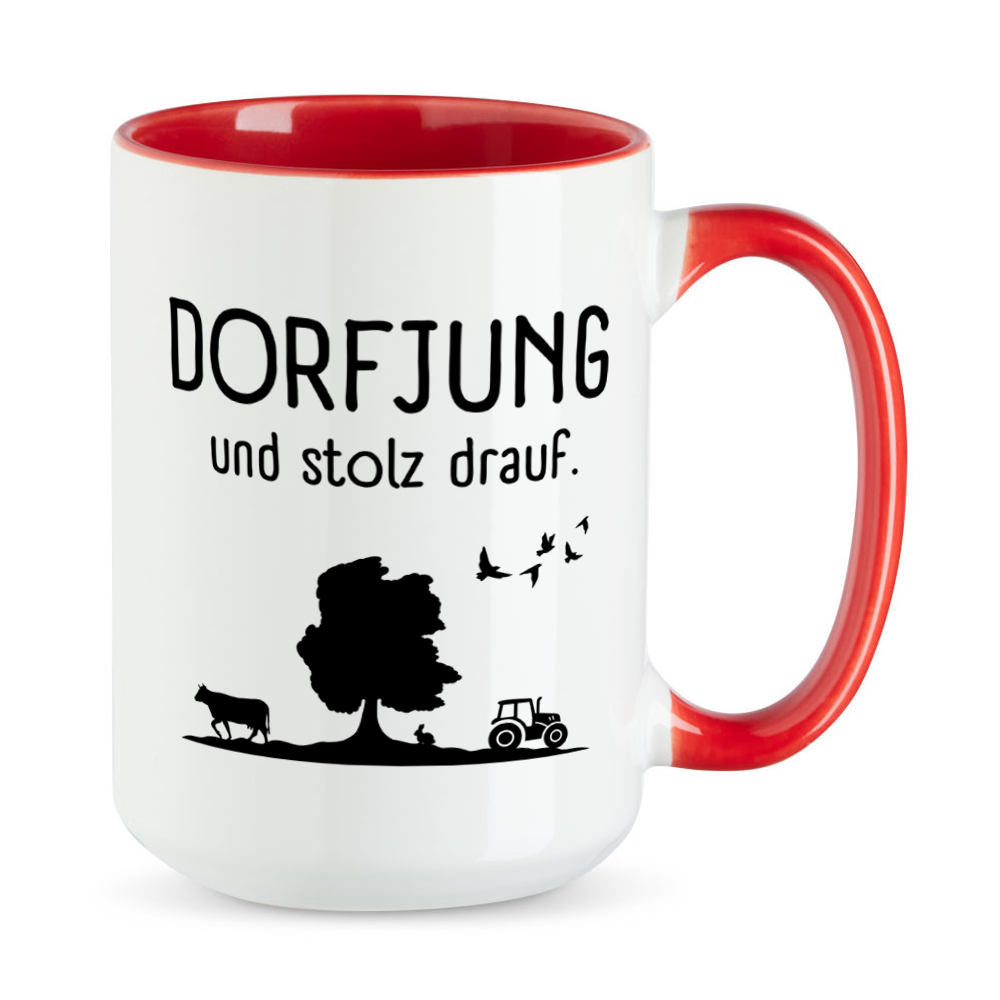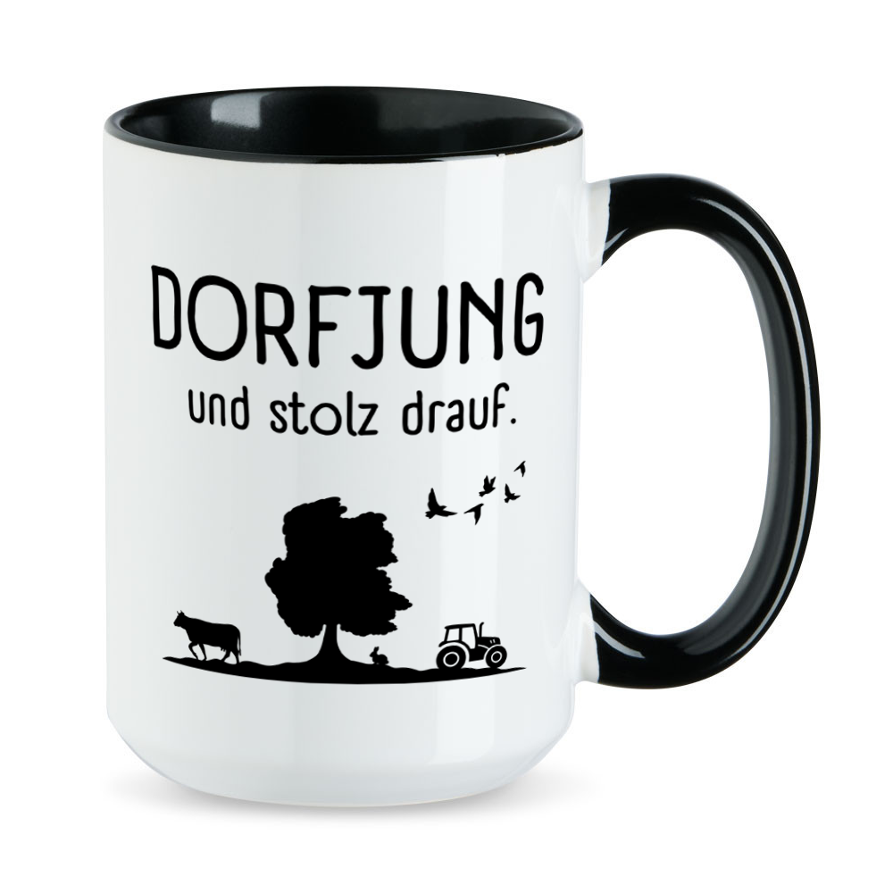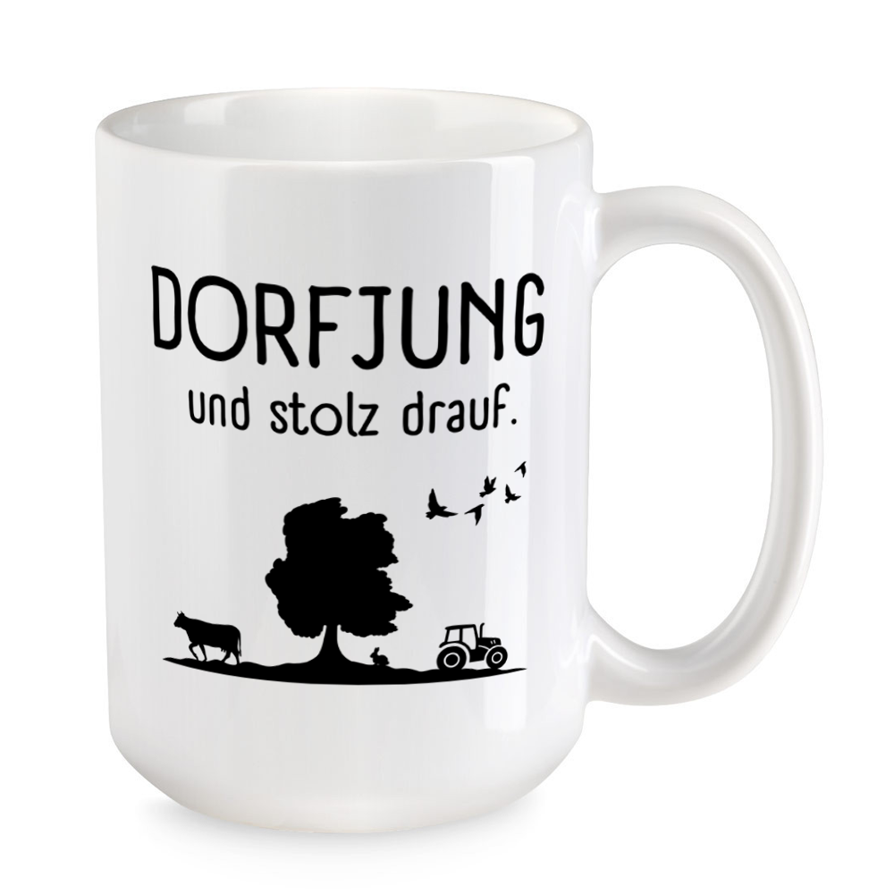 Tiere, Wind, Traktoren und sehr viel Natur. Viele Jungs vom Dorf kennen das alles aus dem täglichen Leben – und lieben es. Ein Dorfjung ist stolz drauf. Mit dieser detailreichen und extra großen Tasse ist klar, für was Dein Herz schlägt: Dorfleben forever.