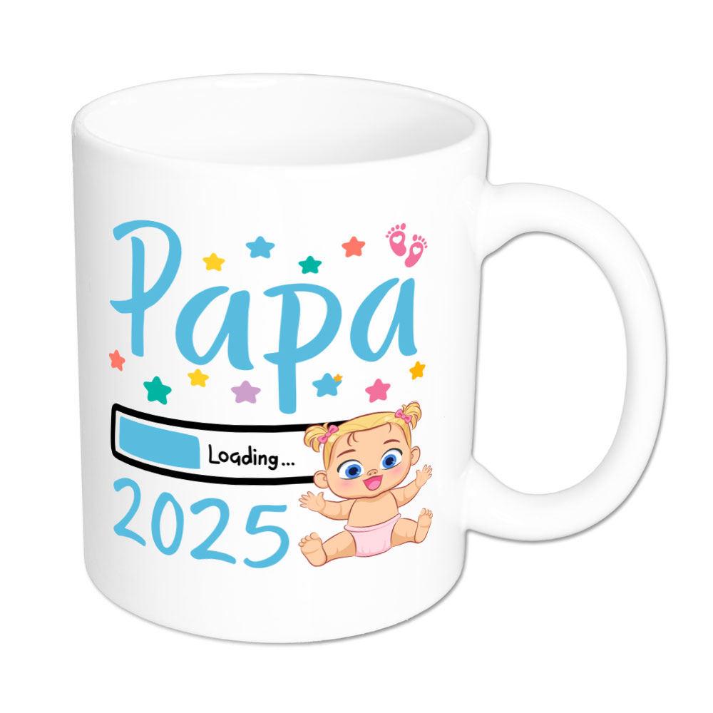 Freudige Ereignisse werfen ihre Schatten voraus, denn die Babys für 2025 sind unterwegs! Die Tasse „Papa Loading 2025“ ist ein schönes Geschenk für jeden werdenden Vater, der 2025 endlich sein Babygirl in den Armen halten darf und es kaum erwarten kann. Die Tasse ist verziert mit Sternen und süßen rosa Babyfüßchen.