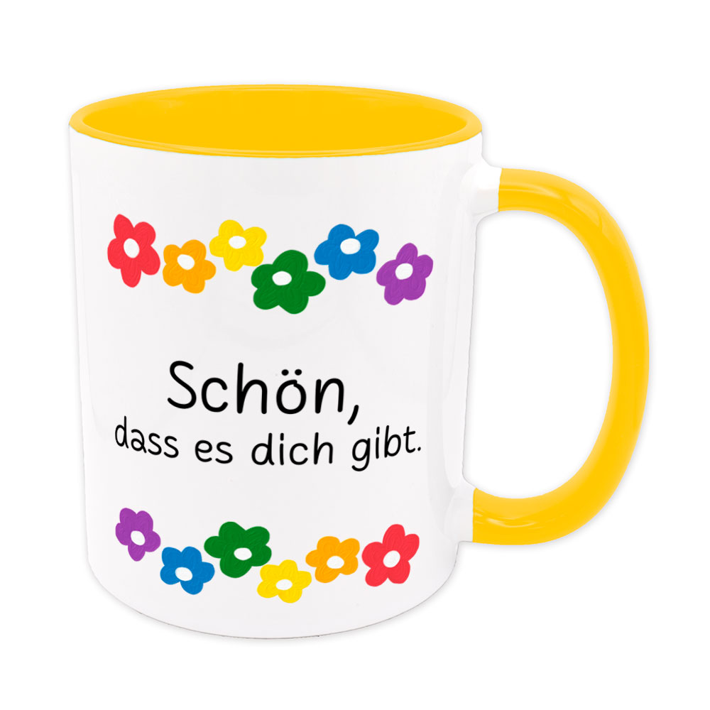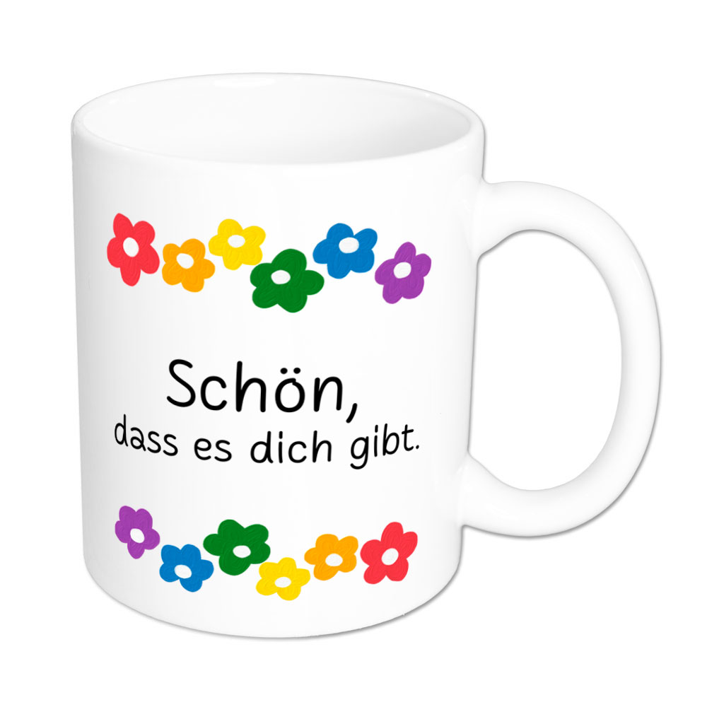 Diese bunte Tasse mit den Gute-Laune-Blümchen ist das perfekte Geschenk für jemanden, der von dir unbedingt wissen sollte: „Schön, dass es dich gibt.“ Als Dankeschön, kleines Mitbringsel, Aufmunterung, Freundschafts- oder Liebesbeweis. Darüber freut sich so gut wie jede und jeder.