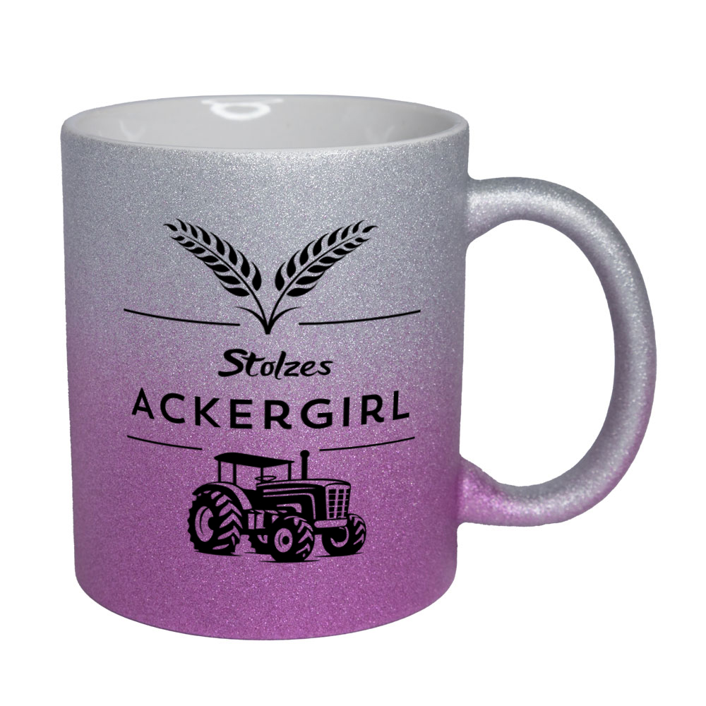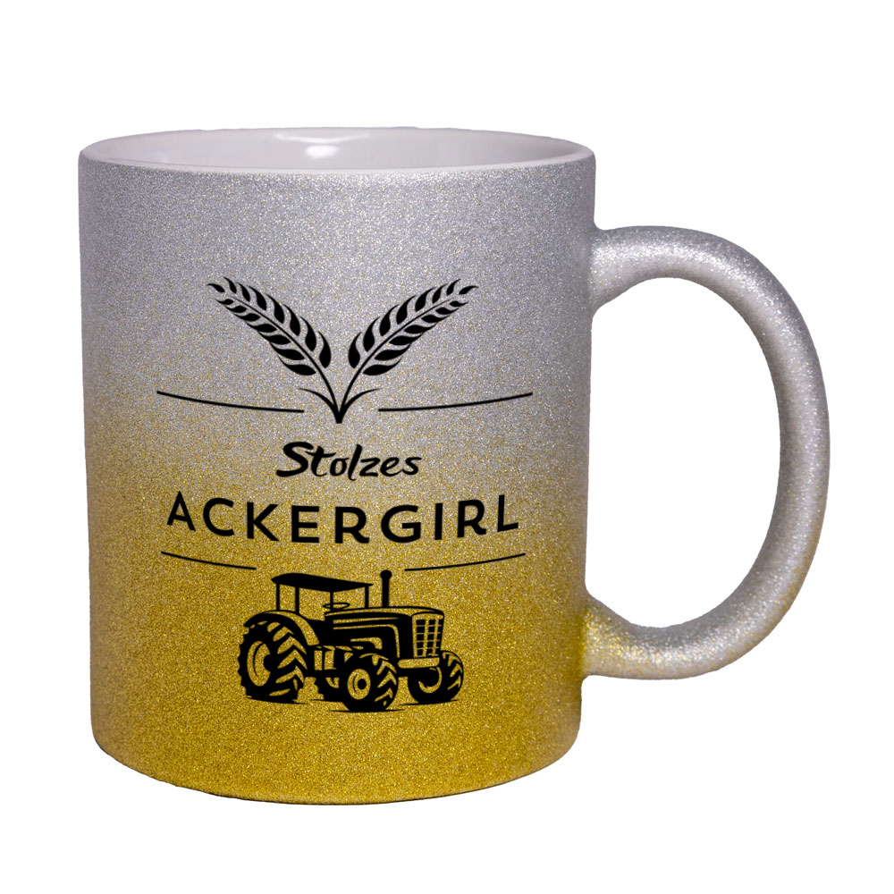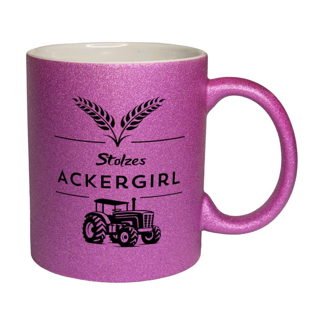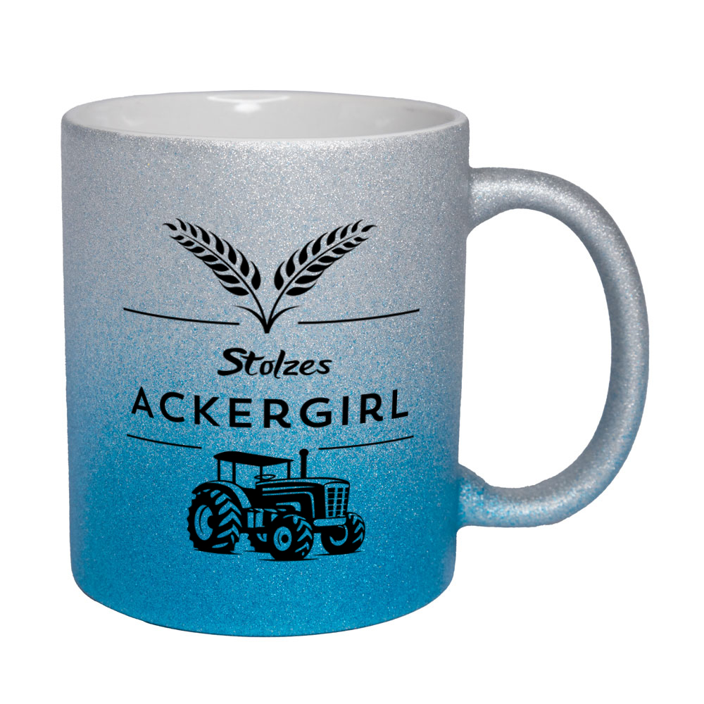 Wer sagt, dass Landwirtschaft nur was für Jungs ist? Sei auch Du mit dieser Glitzertasse ein “stolzes Ackergirl”, denn Du hast alles im Griff, vom Trecker bis zu den Kühen.