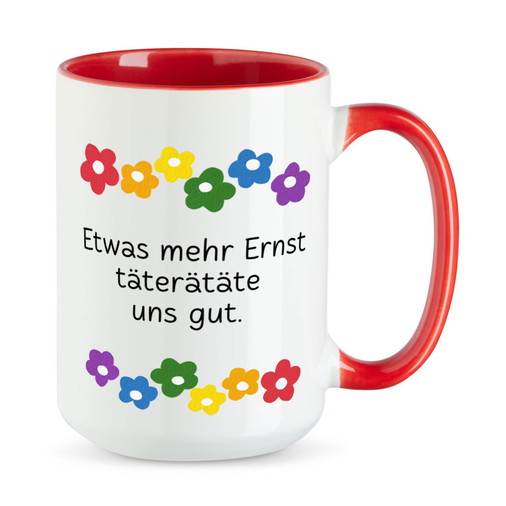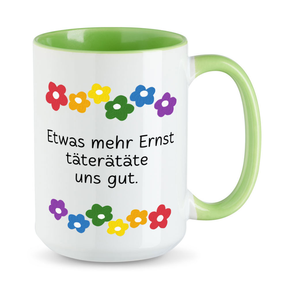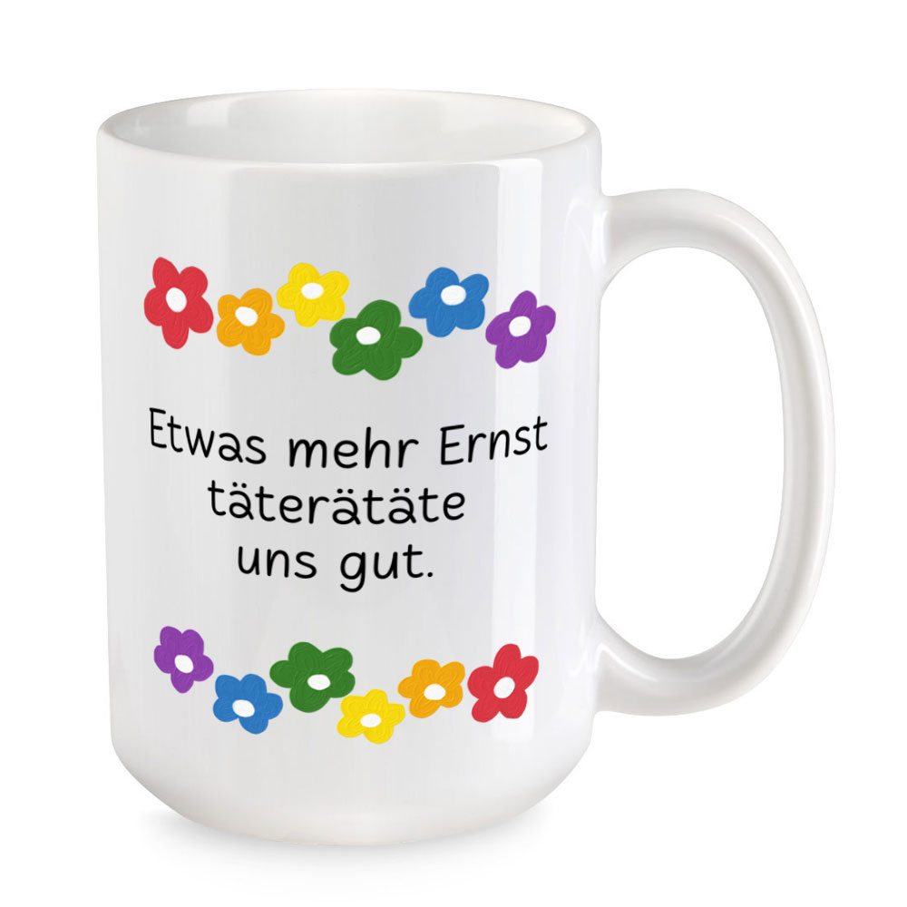 Die Sache ist ernst. Wir sollten sie auch so behandeln. Nachdenken. Nicht lachen. Blabla. Vielleicht führen in genau solchen Situationen ein bisschen Leichtigkeit und Fröhlichkeit zur viel besseren Lösung. Mit der extra großen Sprüchetasse „Etwas mehr Ernst täterätäte uns gut.“ nimmst Du die angestrengte Ernsthaftigkeit aufs Korn.