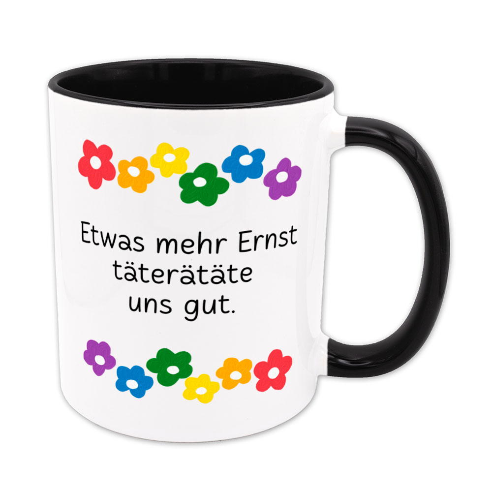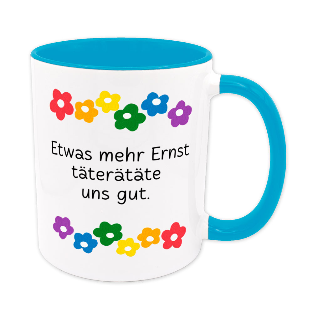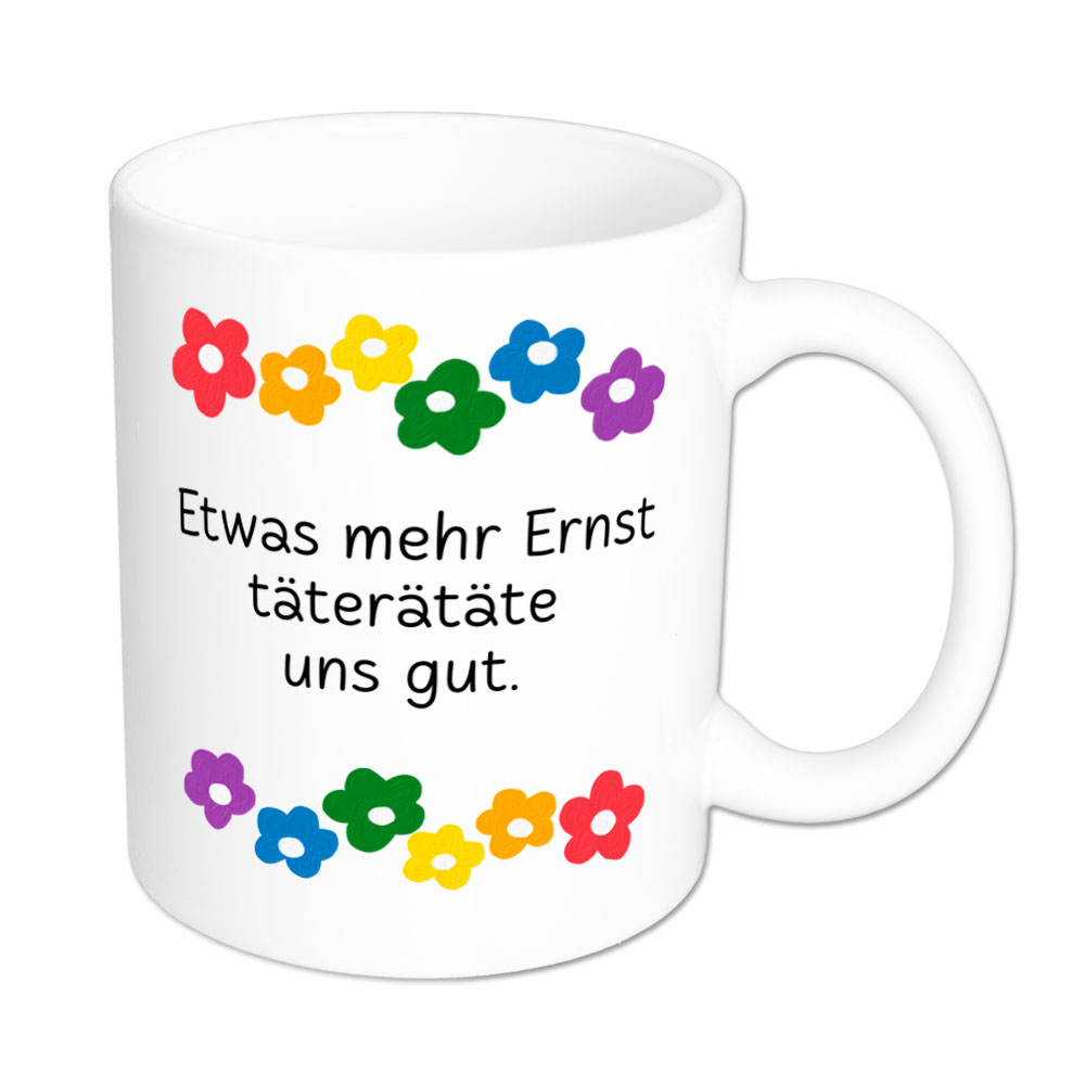 Die Sache ist ernst. Wir sollten sie auch so behandeln. Nachdenken. Nicht lachen. Blabla. Vielleicht führen in genau solchen Situationen ein bisschen Leichtigkeit und Fröhlichkeit zur viel besseren Lösung. Mit der Sprüchetasse „Etwas mehr Ernst täterätäte uns gut.“ nimmst Du die angestrengte Ernsthaftigkeit aufs Korn.
