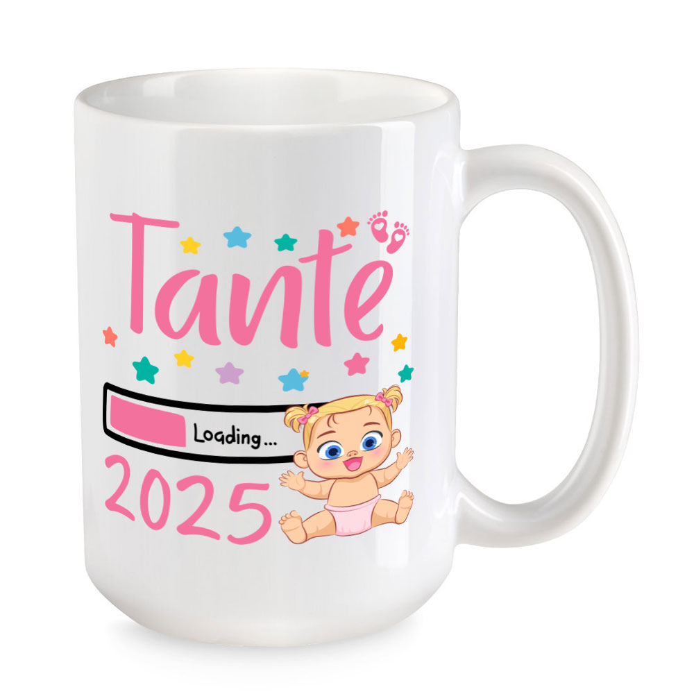 Freudige Ereignisse werfen ihre Schatten voraus, denn die Babys für 2025 sind unterwegs! Die extra große Tasse „Tante Loading 2025“ ist ein schönes Geschenk für jede Bald-Tante, die ihre Nichte in 2025 kaum noch erwarten kann. Die Tasse ist verziert mit Sternen und süßen rosa Babyfüßchen.
