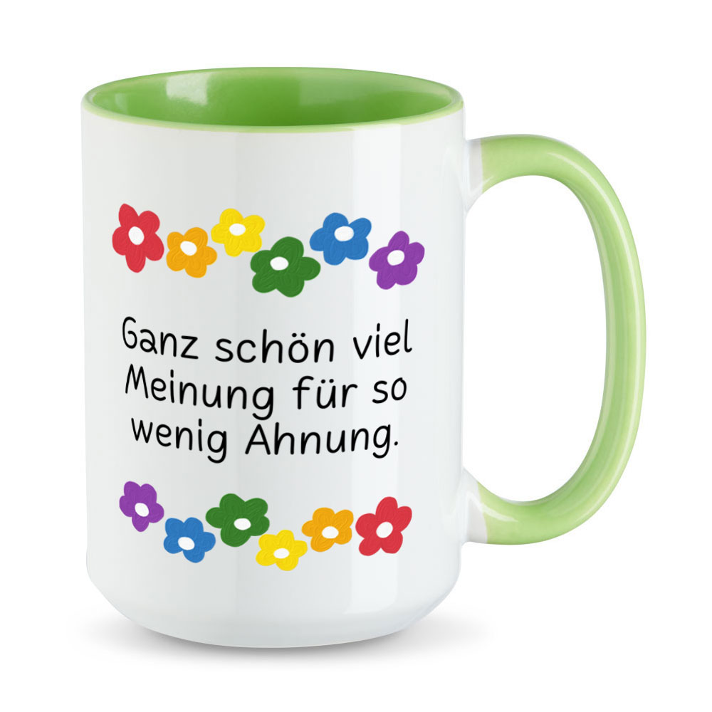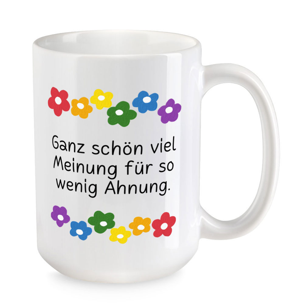 Es gibt die Vermutung, dass diejenigen Menschen, die am wenigsten faktisch über ein Themengebiet wissen, am überzeugtesten sind von ihrem (angeblichen) Fachwissen. Und das tun sie auch lauthals kund. Diese extra große Sprüchetasse kannst Du also jeder hohlen Nuss vor die Nase halten, die mit ihrem Wissen angibt.