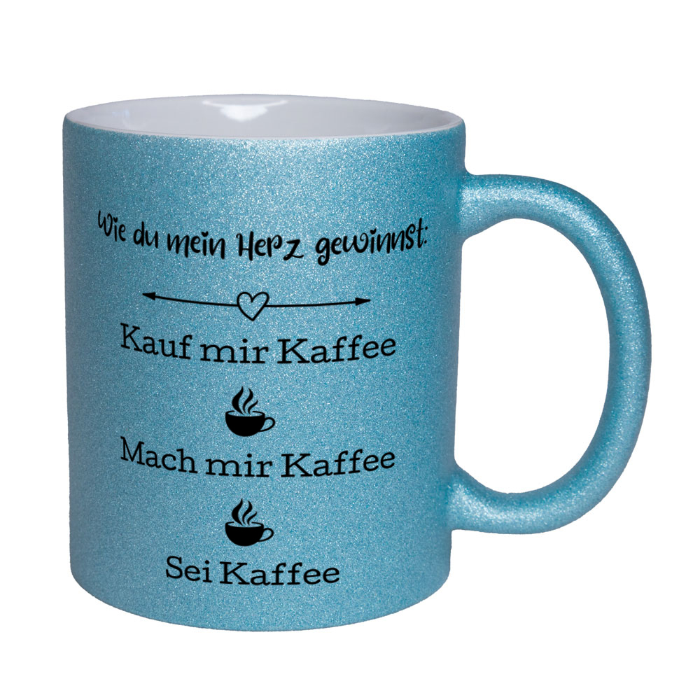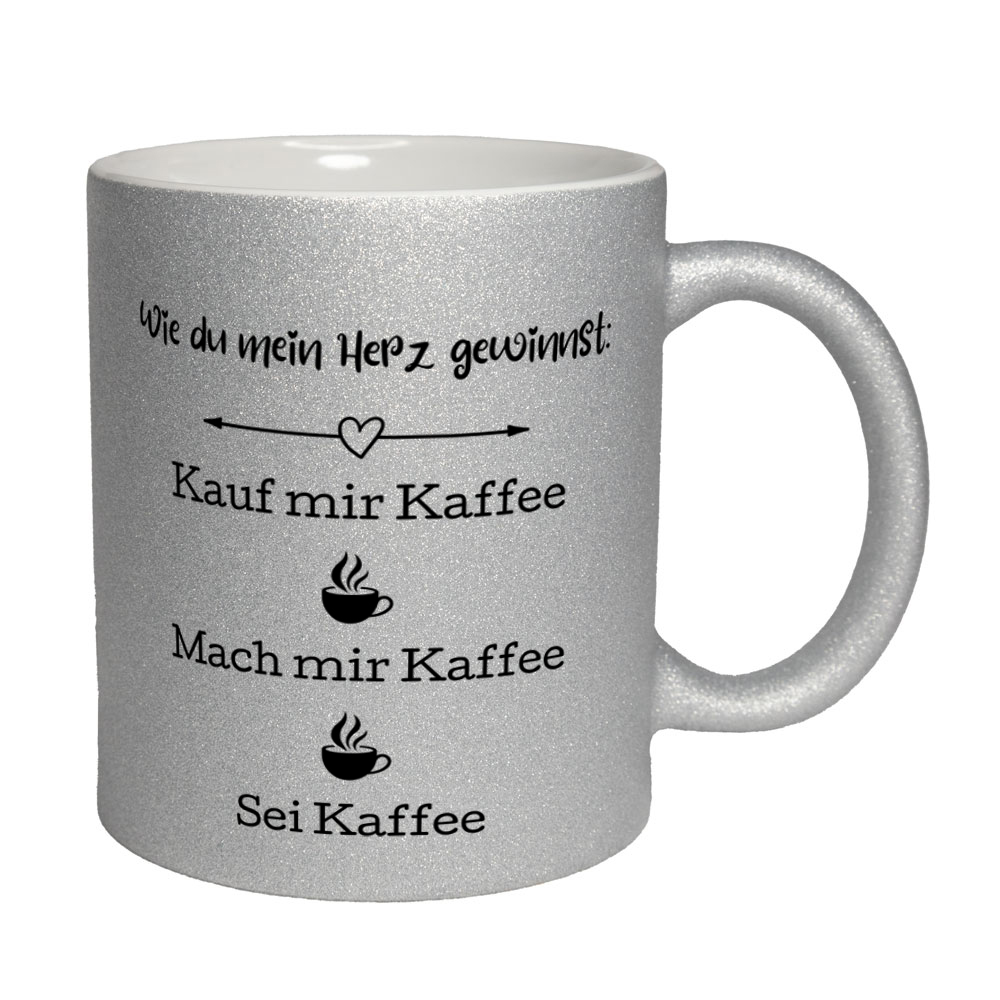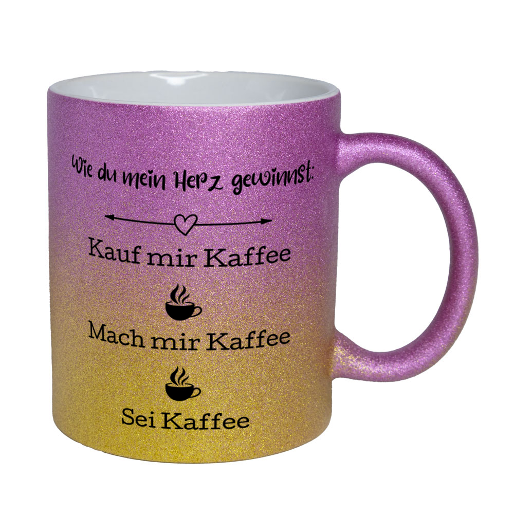 Das Lebenselexier Kaffee geht nicht nur durch den Magen, sondern auch direkt in die Emotionen. Wer Kaffee genauso liebt wie Du, kann nur richtig in Deinem Leben sein. Der Spruch: „Wie Du mein Herz  gewinnst: Kauf mir Kaffee – Mach mir Kaffee – Sei Kaffee“ ist auf einer Glitzertasse in Szene gesetzt.