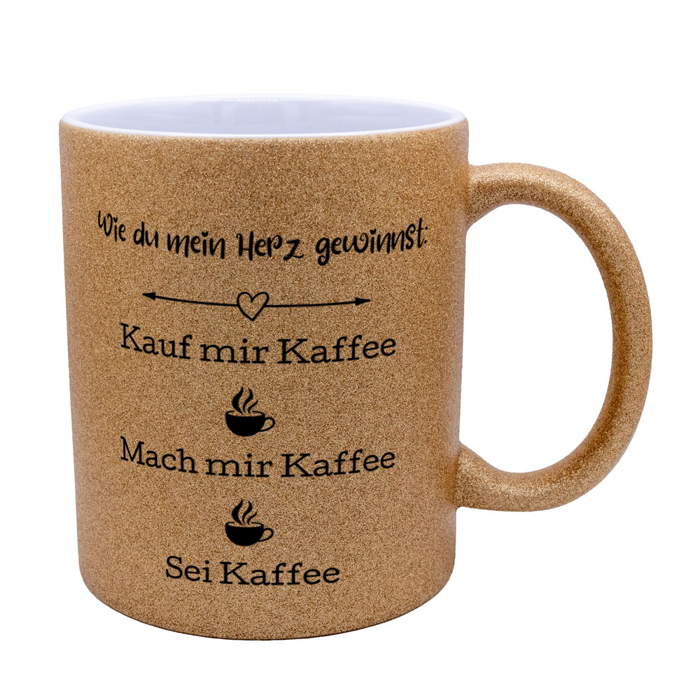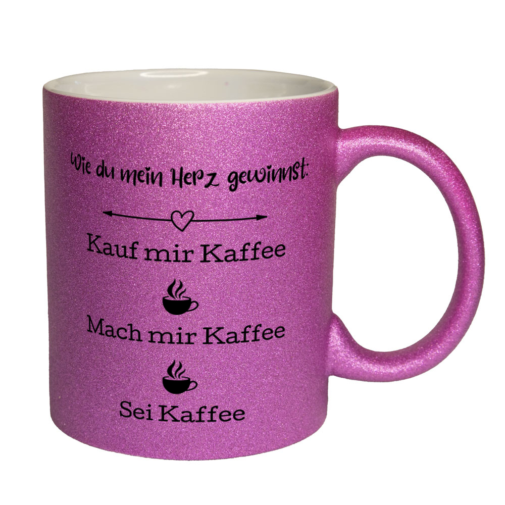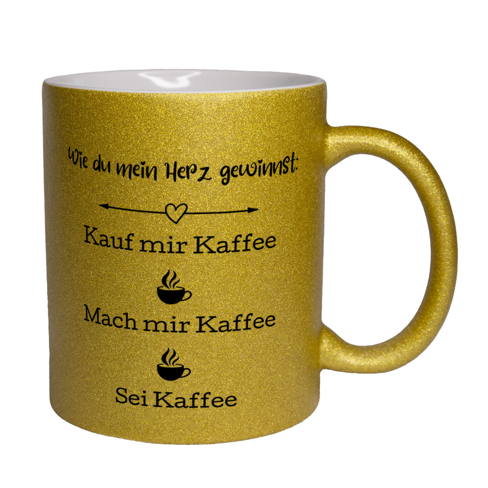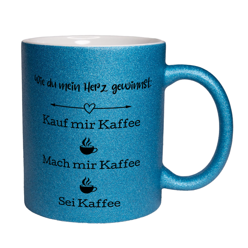 Das Lebenselexier Kaffee geht nicht nur durch den Magen, sondern auch direkt in die Emotionen. Wer Kaffee genauso liebt wie Du, kann nur richtig in Deinem Leben sein. Der Spruch: „Wie Du mein Herz  gewinnst: Kauf mir Kaffee – Mach mir Kaffee – Sei Kaffee“ ist auf einer Glitzertasse in Szene gesetzt.
