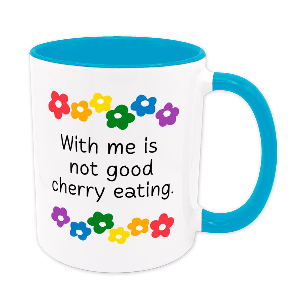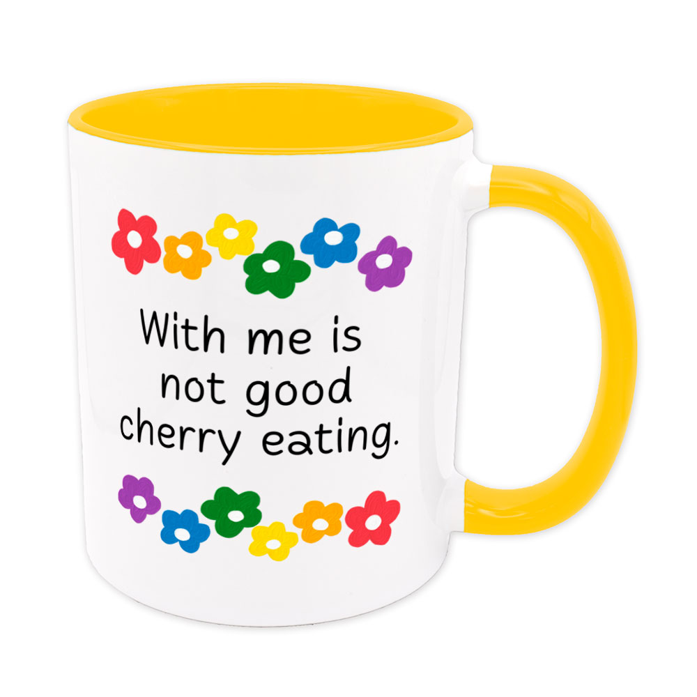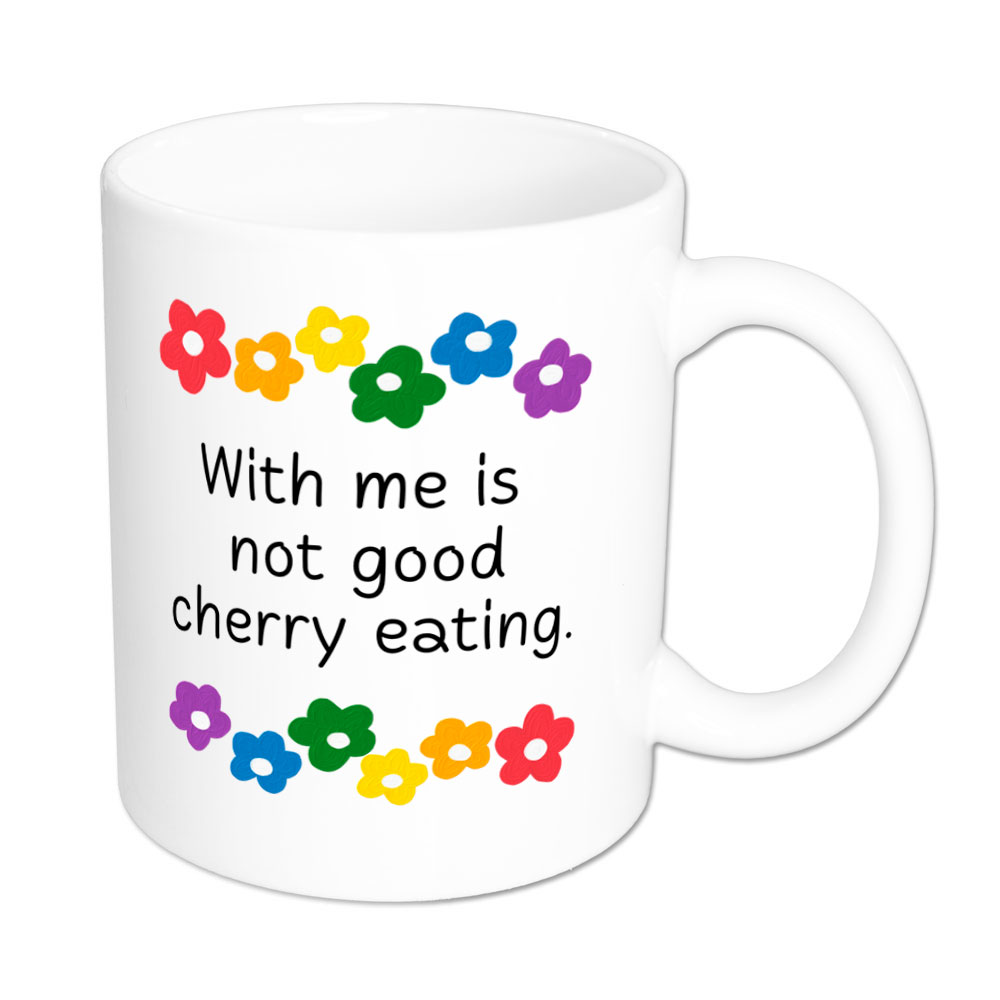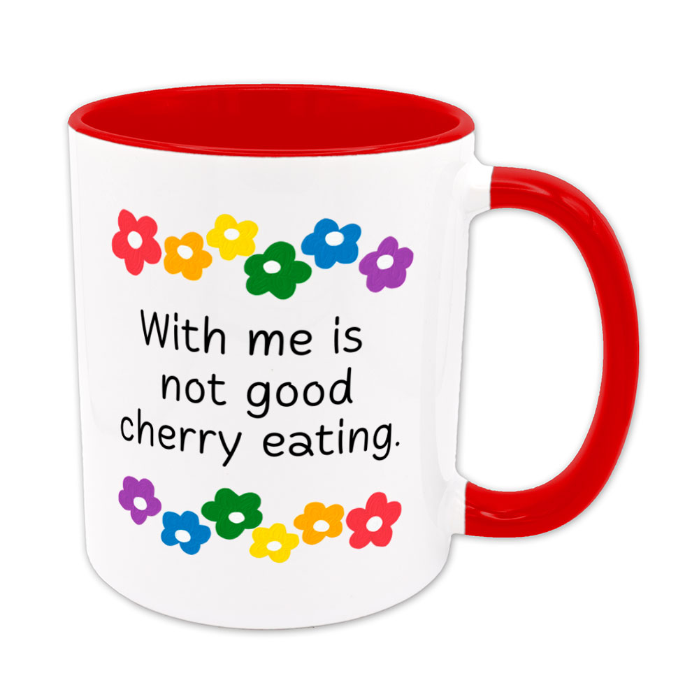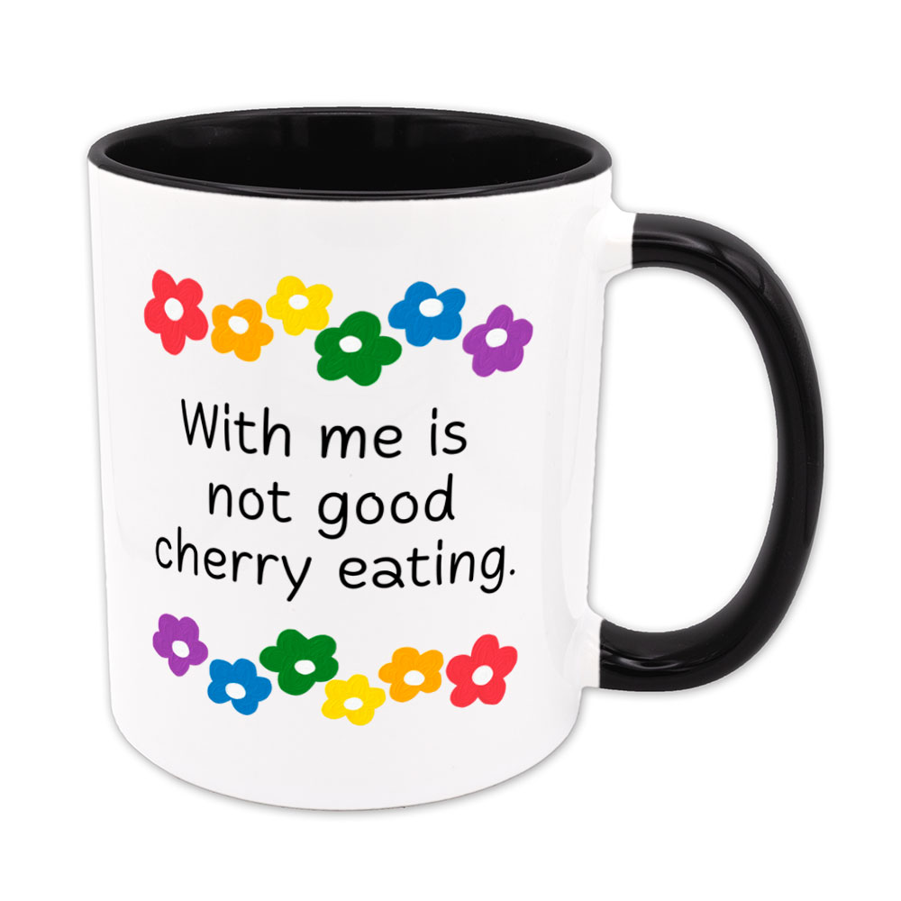 Mit mir ist nicht gut Kirschen essen! Auf Hochniveau-Englisch verspricht diese lustige Sprüchetasse „With me is not good cherry eating.“ eine deutliche Botschaft, bitte Abstand zu halten – erst Recht, wenn der Kaffee leer ist!