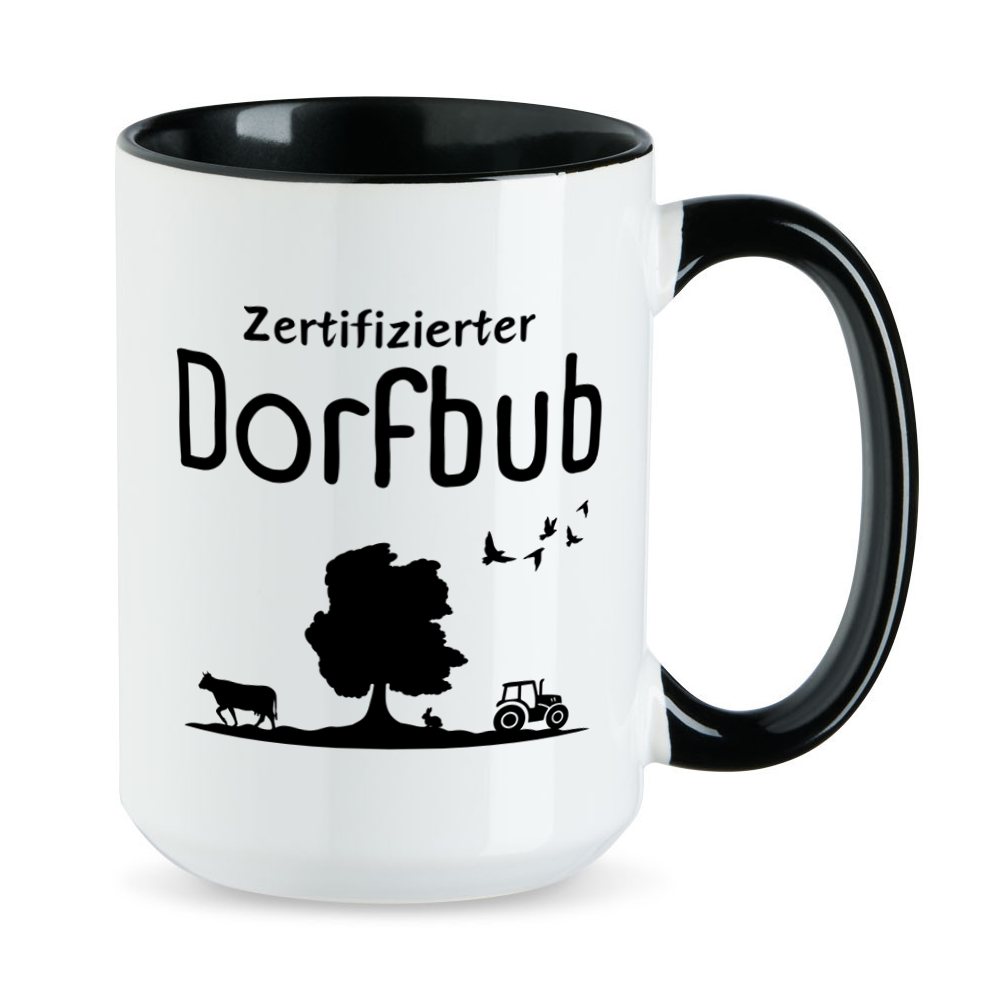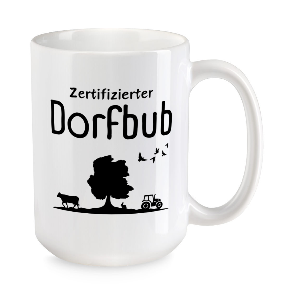 Tiere, Wind, Trecker und sehr viel Natur. Viele Jungs vom Dorf kennen das alles aus dem täglichen Leben – und lieben es. Das zertifiziert sie zu “echten” Dorfbuben. Mit dieser XL-Tasse ist klar, für was Dein Herz schlägt. Dorfleben forever. Eine Kuh, ein (wildlebender) Hase, ein Traktor, Vögel und ein Baum runden das Motiv ab.