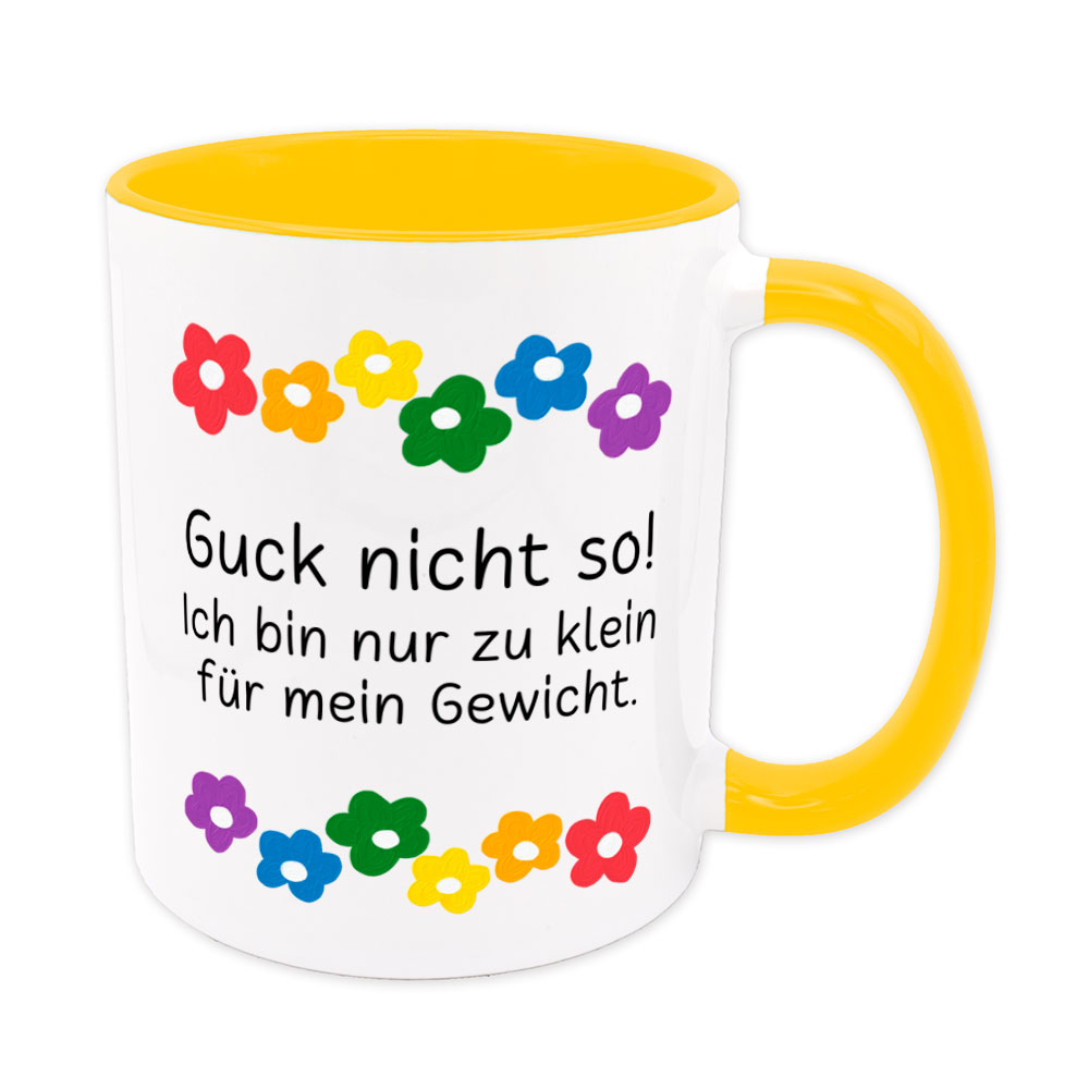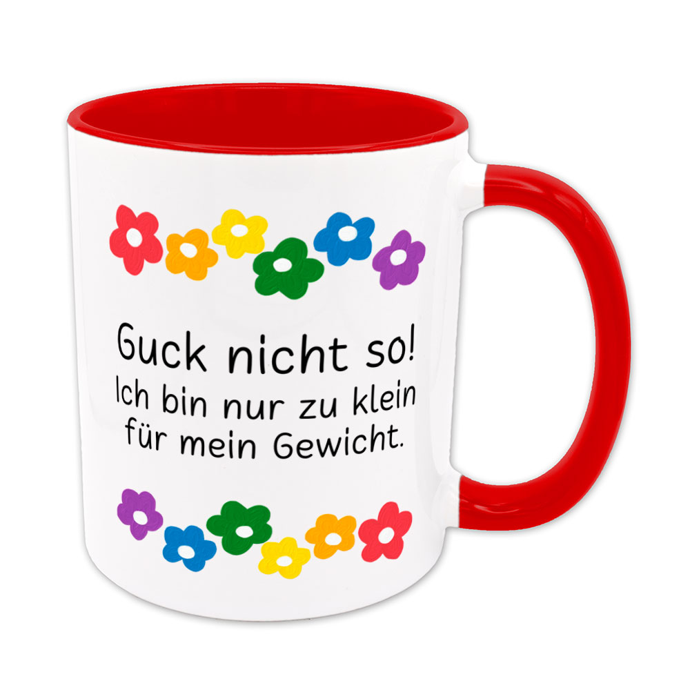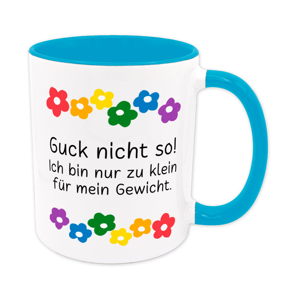 Die witzig-bunte Sprüchetasse „Guck nicht so! Ich bin nur zu klein für mein Gewicht.“ nimmt allen Kritikern, Bodyshaming-Aktivisten und Neidern direkt den Wind aus den Segeln.